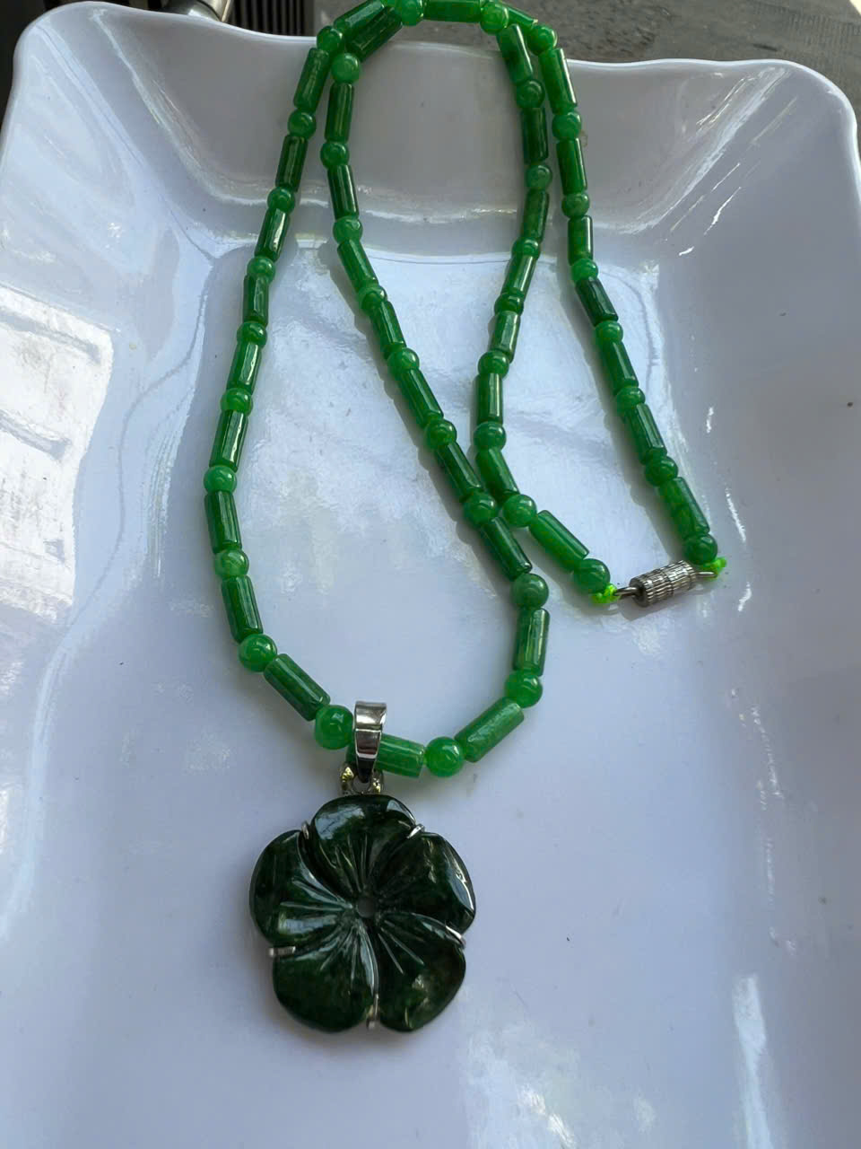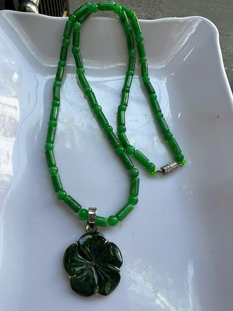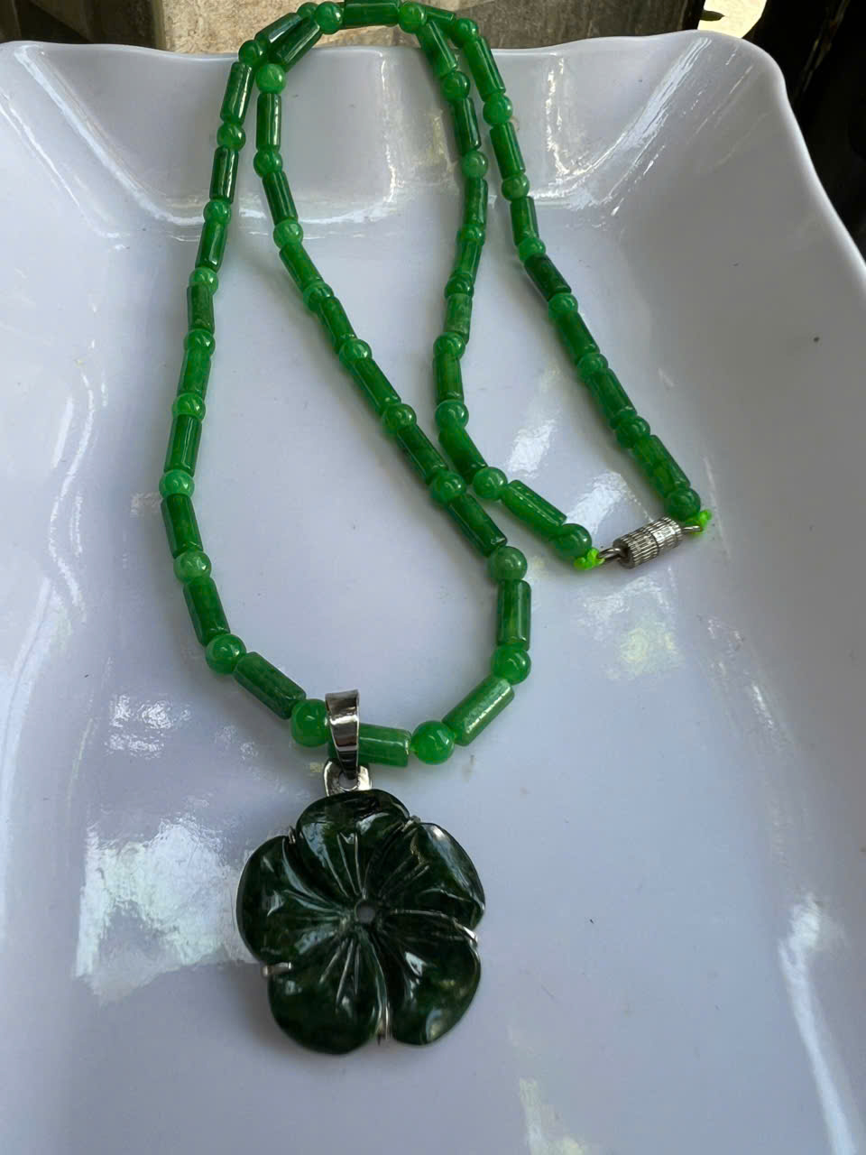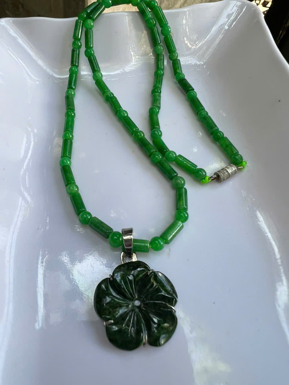 Thiết kế độc đáo: Bộ dây chuyền sợi trúc kiểu xanh phối mặt bông hoa mai. Đá cẩm thạch tự nhiên xanh ngọc đậm đẹp.