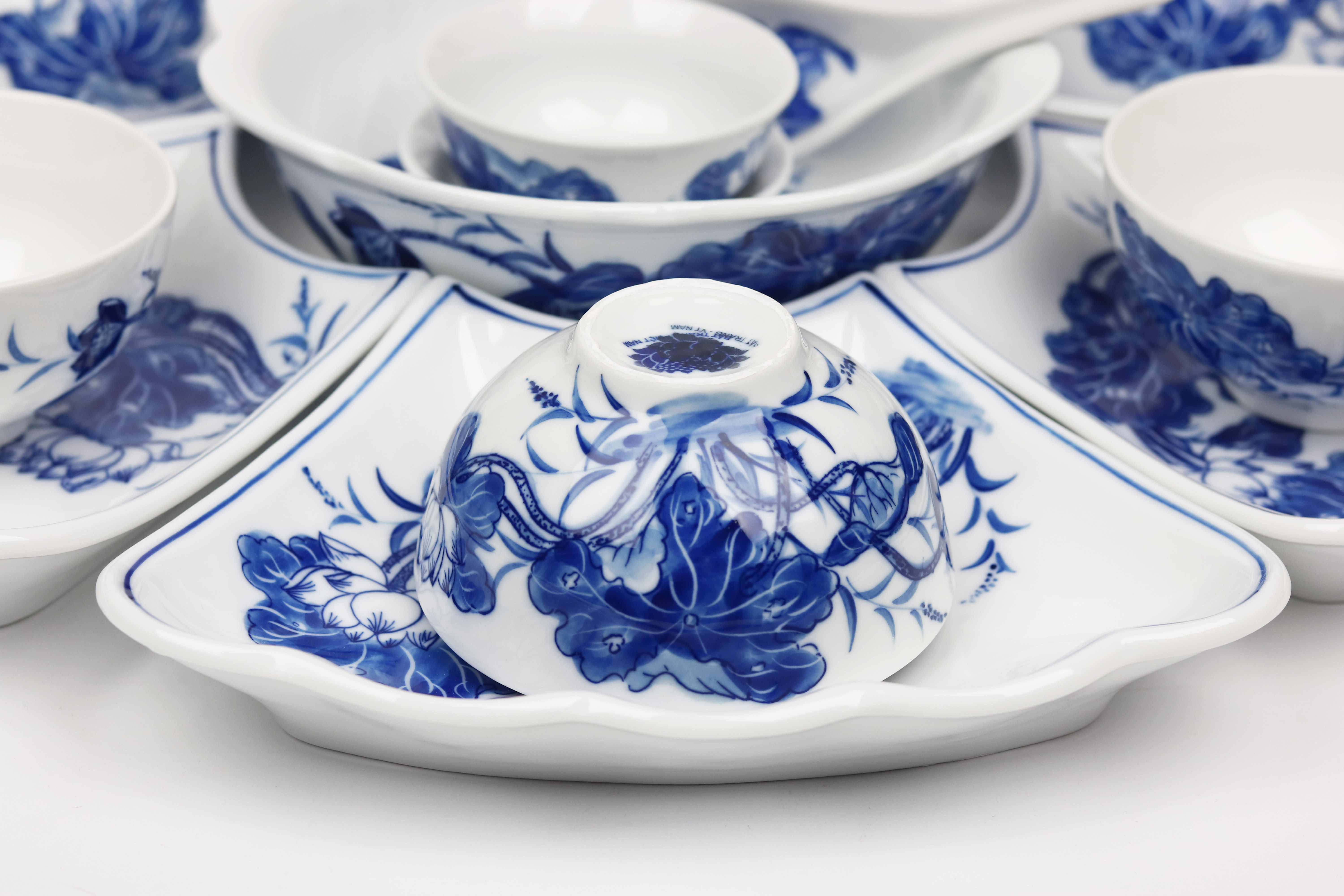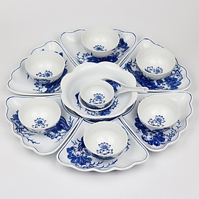 Bộ đồ ăn men lam vẽ hoa đào Gốm sứ Bát Tràng cao cấp không chì Bộ đồ ăn gồm 15 món như hình 6 bát cơm 1 bát mắm 1 đĩa muối 1 đĩa