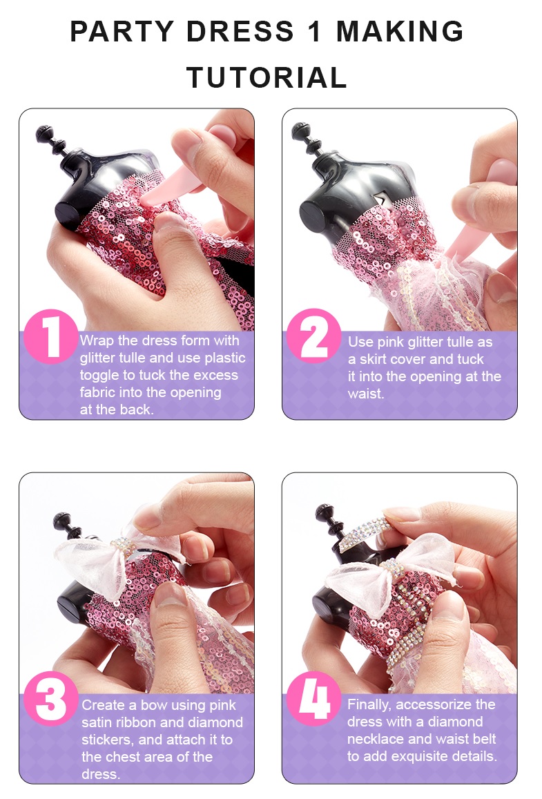 - Ruy băng - viền ren các lại Với hướng dẫn rất cụ thể, chi tiết trong bộ sản phẩm, bé có thể thực hành làm một chiếc váy đuôi cá cực xinh luôn cả nhà ạ Bước 1: Đặt vải ôm sát thân ma nơ canh. Nhét phần vải dư vào giữa lưng ma nơ canh Bước 2: Tiếp tục sử dụng vải tuyn hồng làm lớp váy lót và nhét phần vải dư vào giữa lưng ma nơ canh Bước 3: Thiết kế nơ bằng vải ruy băng và sticker kim cương. Dán nơ phần trước ngực bằng chấm keo Bước 4: Tiếp tục thiết kế phụ kiện như vòng cổ, thắt lưng bằng sticker kim cương hoặc các phụ kiện khác theo sự sáng tạo của bé. Khi bé hoàn thành các thiết kế, bố mẹ đừng ngại ngần trao giải nhà thiết kế cao cấp cho bé thêm yêu thích Trong bộ đồ chơi còn có sẵn 1 showroom trưng bày nho nhỏ - mang đến ngạc nhiên cho bé - bé thật sự nhập vai với việc mình được trở thành 1 nhà thiết kế thời trang chuyên nghiệp - khơi gợi đam mê và thành công cho bé sau này
