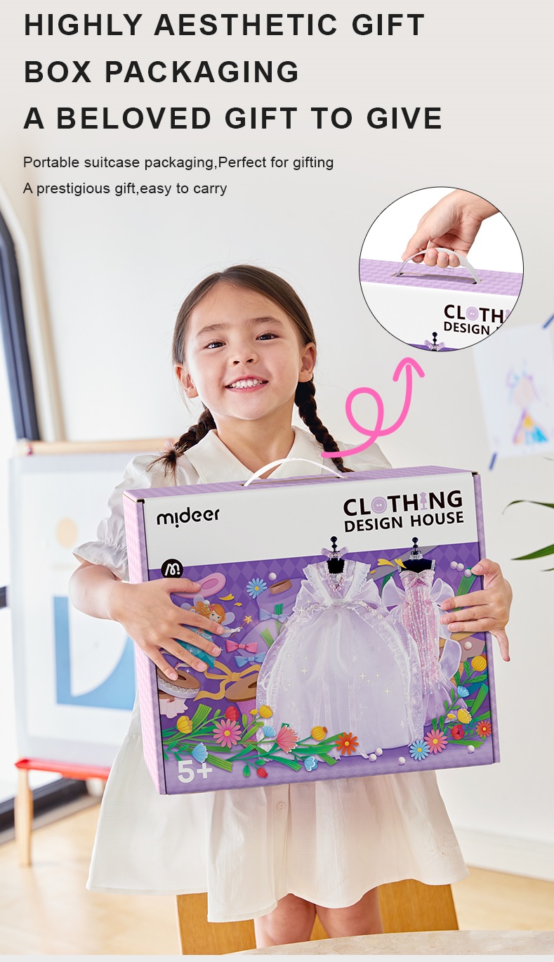 - Thương hiệu: Mideer, được nhập khẩu và phân phối chính hãng tại Việt Nam Với Clothing Design House là bộ môn nghệ thuật và đồ thủ công thử thách cho trẻ em từ 5 đến 12 tuổi, những người thích thể hiện phong cách của mình, kích thích đam mê, sáng tạo. Bộ dụng cụ thiết kế thời trang cho bé gái trổ tài thiết kế thời trang và đưa ra các lựa chọn vô tận cho những ý tưởng nghệ thuật. Đặc biệt thiết kế thủ công không cần đến kim khâu đảm bảo an toàn cho bé. Đồ chơi thiết kế thời trang Clothing Design House bao gồm: Một chiếc thiệp mời xinh xắn: Chào mừng bé đến với học viện thiết kế thời trang Mideer sẽ khiến cho bé yêu của bạn có được cảm giác thành công, khuyến khích sự sáng tạo vô bờ bến của con.