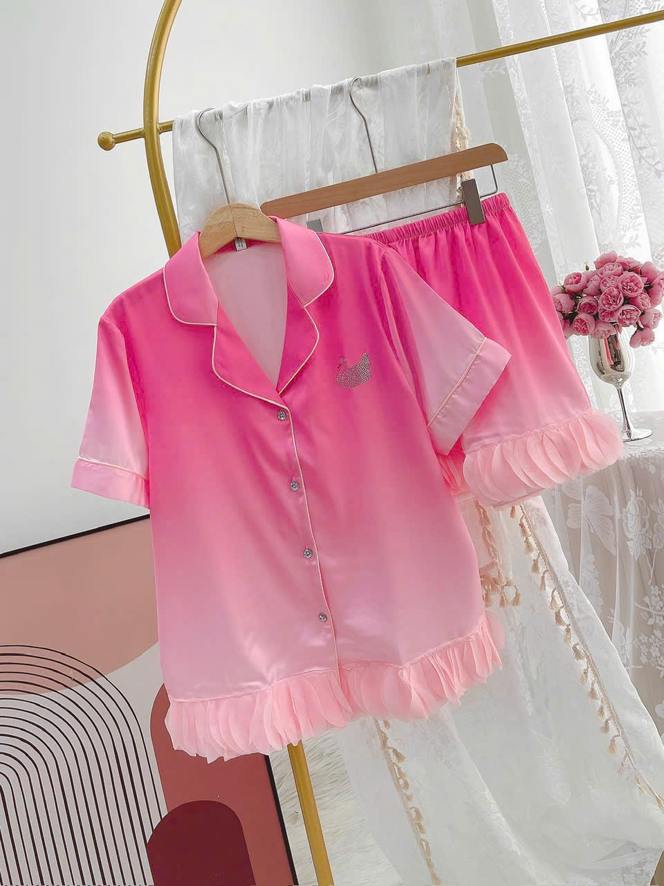 ✨Bộ Đồ Ngủ B291 Lụa Quảng Châu Cao Cấp Đính Đá Thiên Nga Xinh Xắn