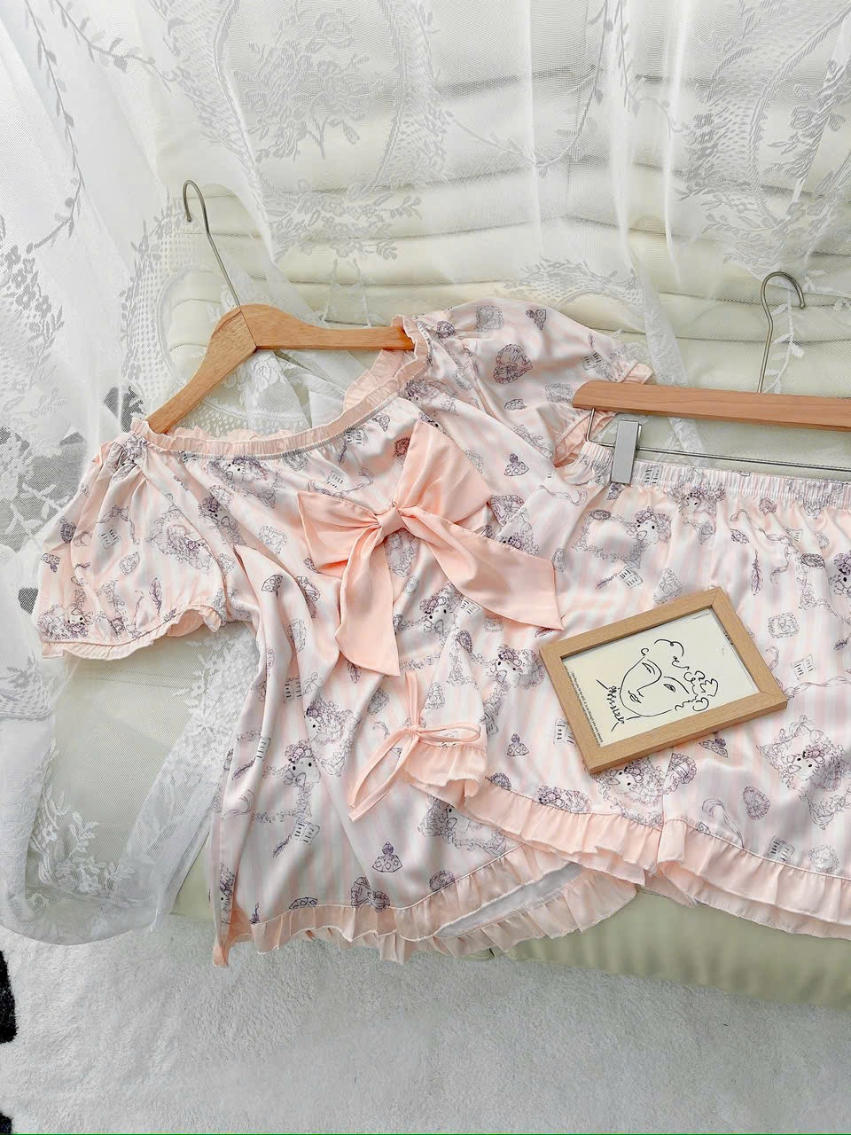 Đồ bộ mặc nhà WANNABE BSS37 đồ bộ quần sọt áo hai dây bản to trang trí nơ xinh xắn dễ thương Đồ bộ mặc nhà phi lụa cao cấp Wannabe BSS37 theo phong cách