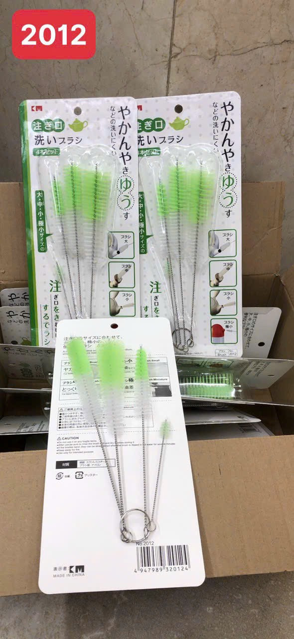Bộ dụng cụ cọ rửa bình nước KM-2012 hàng Nhật Bộ sản phẩm 4 chiếc cọ gồm : - 1 chiếc ngắn nhất 9.5cm - 1 chiếc vừa 17.5 cm - 2 chiếc to dài 18