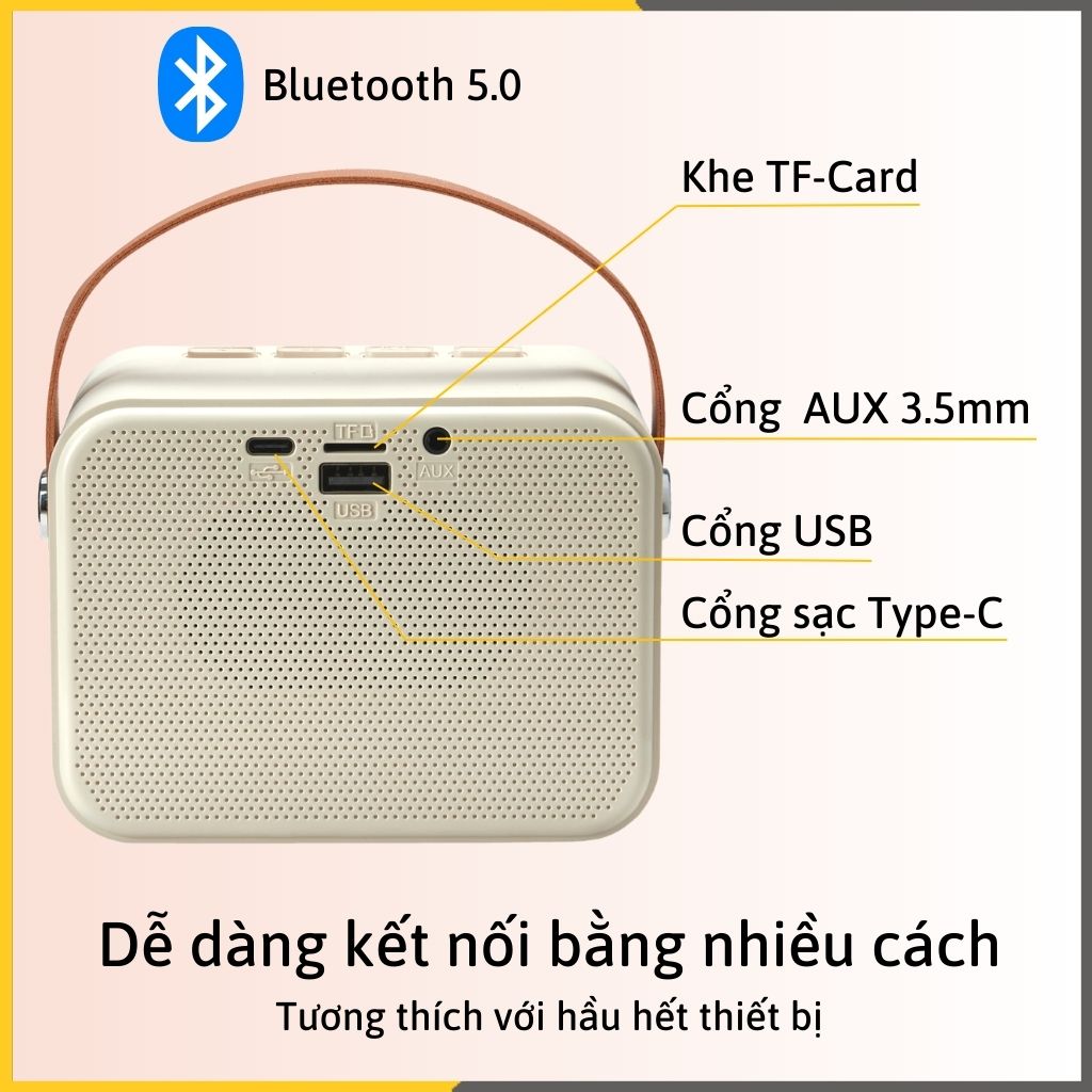 • Kết Nối Đa Dạng – Bluetooth 5.0, USB, TF-Card, AUX Tương thích hầu hết thiết bị di động và máy tính – đơn giản hóa kết nối, chỉ cần bật và hát.