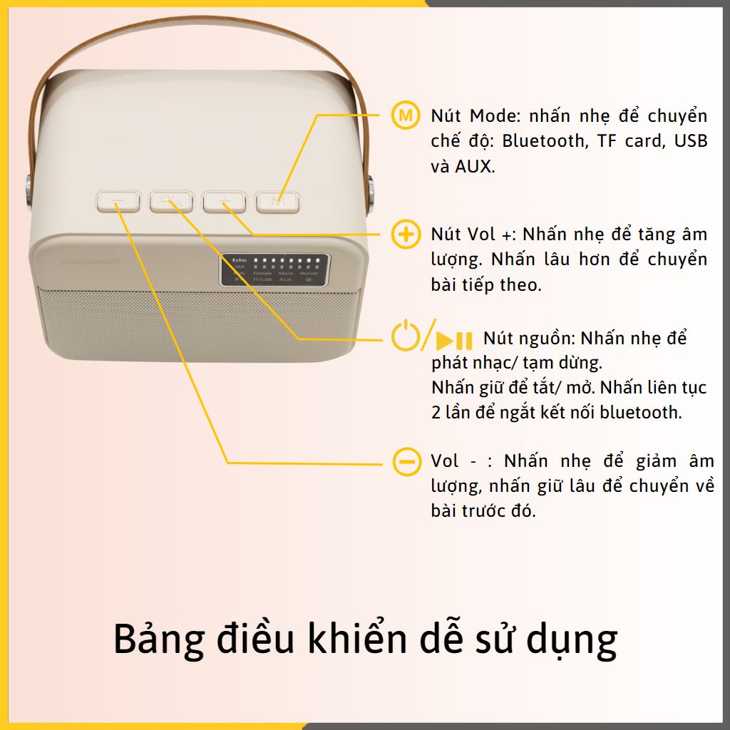 ĐẶC ĐIỂM NỔI BẬT - Kết nối Bluetooth 5.3 phát nhạc không dây - Micro tích hợp với chức năng hát Karaoke - Chức năng chỉnh Echo / microphone / music cho chất lượng giọng