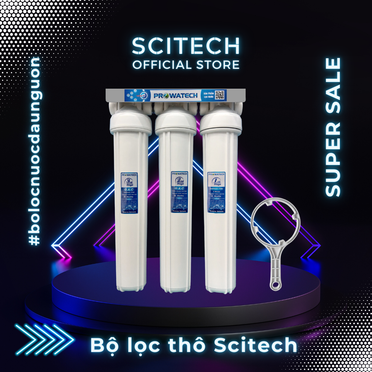 Bộ lọc nước sinh hoạt 10 inch 3 cấp lọc by Scitech giúp lọc sạch cặn bẩn, rỉ sét, rong rêu, chất hữu cơ và các tạp chất khác lẫn trong nước. Bộ lọc thích