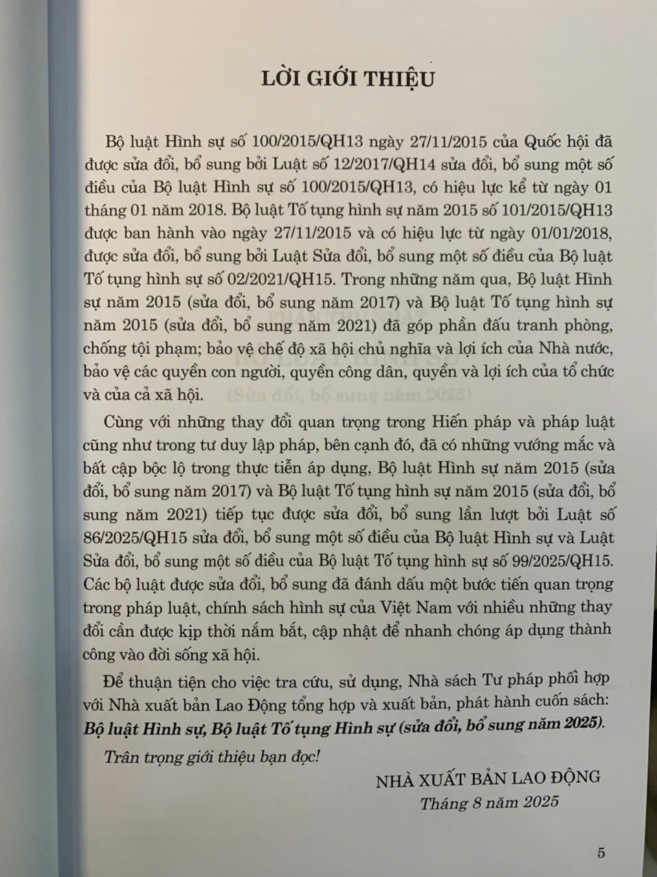 Cùng với những thay đổi quan trọng trong Hiến pháp và pháp luật cũng như trong tư duy lập pháp, bên cạnh đó, đã có những vướng mắc và bất cập bộc lộ trong thực tiễn áp dụng, Bộ luật Hình sự năm 2015 (sửa đổi, bổ sung năm 2017) và Bộ luật Tố tụng hình sự năm 2015 (sửa đổi, bổ sung năm 2021) tiếp tục được sửa đổi, bổ sung lần lượt bởi Luật số 86/2025/QH15 sửa đổi, bổ sung một số điều của Bộ luật Hình sự và Luật Sửa đổi, bổ sung một số điều của Bộ luật Tố tụng hình sự số 99/2025/QH15. Các bộ luật được sửa đổi, bổ sung đã đánh dấu một bước tiến quan trọng trong pháp luật, chính sách hình sự của Việt Nam với nhiều những thay đổi cần được kịp thời nắm bắt, cập nhật để nhanh chóng áp dụng thành công vào đời sống xã hội.
