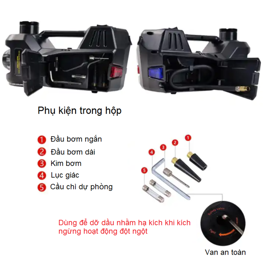 - Tất cả đều dùng nguồn 12V có sẵn trên ô tô Sản phẩm kèm theo: Găng tay bảo hộ, dây cáp kẹp lấy điện từ ắc quy, búa thoát hiểm chỉ cần đưa dây an toàn vào khe có gắn lưỡi dao là có thể dễ dàng cắt đứt dây và thoát hiểm. Phần búa đục với đầu nhọn, tập trung lực lớn, giúp làm vỡ kính xe (Lưu ý khi đập kính xe, nên đập ở góc, vì kính xe là kính cường lực, do đó, đập ở góc sẽ dễ dàng vỡ kính ở giữa tấm kính). Bơm lốp tích hợp trong bộ nâng kích gầm. Thông số kỹ thuật