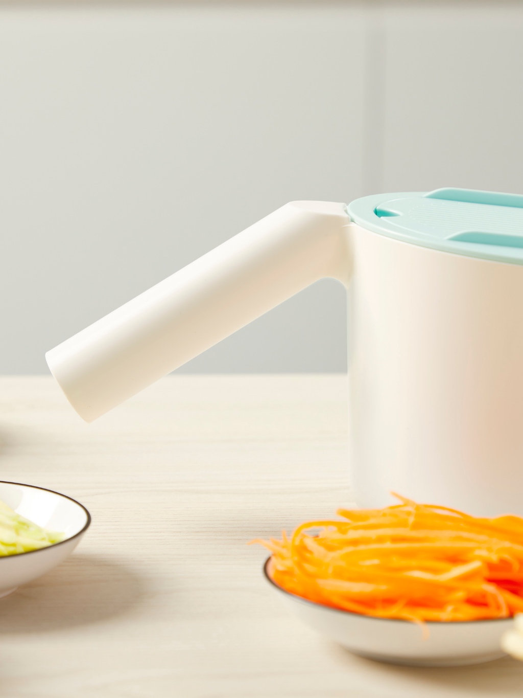 Thay thế đến 8 dụng cụ nhà bếp, US4000M không chỉ hỗ trợ quay vắt khô ráo thực phẩm mà còn giúp chế biến, tạo hình rau củ quả nhanh chóng. Dung tích chứa 4L