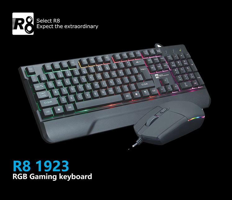 Bộ bàn phím + chuột có dây USB 2.0 R8 1923 - Đen Công nghệ chống mờ laser Đèn led 7 màu 1/ Bàn phím : Thiết kế đặc biệt: giảm thiểu tiếng ồn khi