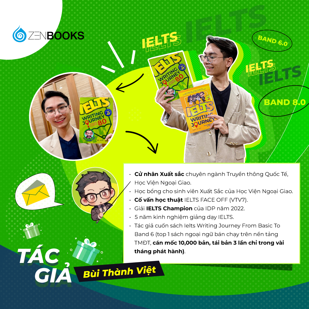 Từ lần thi thử đầu tiên tại IDP chỉ đạt 4.0 IELTS, chàng trai sinh năm 2001 Bùi Thành Việt đã trải qua tổng cộng 8 lần thi IELTS, tiến bộ dần dần và kết quả gần nhất là 8.5 Overall (8.5 Writing). Cuốn sách “IELTS Writing Journey from Basics to Band 6.0” chính là công thức, là đúc kết mọi bí quyết trong quá trình khổ luyện đó của Bùi Thành Việt - hiện là giáo viên IELTS hot hit tại Hà Nội với 5 năm kinh nghiệm giảng dạy; là cố vấn học thuật chương trình IELTS FACE OFF (VTV7).