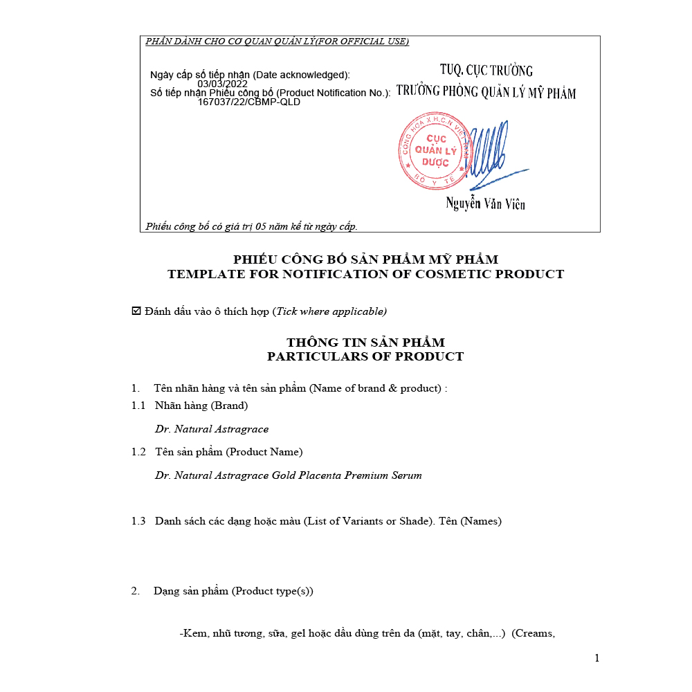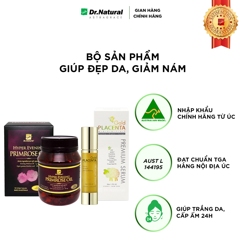 - Serum nhau thai cừu Dr. Natural Astragrace Gold Placenta Premium Serum bổ sung dưỡng chất từ Nhau thai cừu, Glutathione giúp làm sáng da, ngăn ngừa lão hóa, chống nhăn da và cải thiện độ đàn hồi của da, cung cấp dưỡng chất và độ ẩm cho da giúp da khỏe, mịn màng, tươi sáng. CHI TIẾT SẢN PHẨM I. VIÊN UỐNG NỘI TIẾT TỐ HYPER EVENING PRIMROSE OIL THÀNH PHẦN: Trong 1 viên nang mềm: Dầu hoa anh thảo (Evening Primrose Oil) 1000mg (Axit Gamma-Linolenic (GLA) 100mg). Phụ liệu: vừa đủ 1 viên CÔNG DỤNG: Giúp giảm các triệu chứng của tiền mãn kinh, mãn kinh, hỗ trợ đẹp da. Số ĐKSP của Bộ Y Tế:11986/2020/ĐKSP (Giấy phép cấp lần 3) Lưu ý: Thực phẩm này không phải là thuốc và không có tác dụng thay thế thuốc bệnh. Không dùng cho phụ nữ có thai và rong kinh. Dừng uống nếu mẫn cảm với một trong các thành phần của sản phẩm LIỀU DÙNG :uống 2-3 viên /ngày. Uống tốt nhất sau khi ăn QUY CÁCH: 90 viên và 180 viên XUẤT XỨ: Australia II/ SERUM VÀNG Nhau thai cừu Dr. Natural Astragrace Gold Placenta Premium nhập khẩu chính hãng (50 ml) Nhau thai cừu được sử dụng để làm đẹp và chống lão hóa từ hàng nghìn năm về trước. Thông qua nhiều thí nghiệm, nhà khoa học nổi tiếng người Nga W.P. Filatov đã kết luận rằng nhau thai cừu có tác dụng rất lớn trong việc tái tạo các tế bào và tiêu diệt các chất độc hại trong cơ thể. Và nhiều nghiên cứu khác cho thấy, nhau thai cừu có tác dụng bổ sung dưỡng chất cho da, thúc đẩy hoạt động của tế bào da, tổ chức lại các lớp da, giúp da đào thải độc tố và hấp thu tốt các thành phần dinh dưỡng, giữ cho làn da luôn khỏe mạnh. SERUM VÀNG Dr. Natural Astragrace Gold Placenta Premium Serum