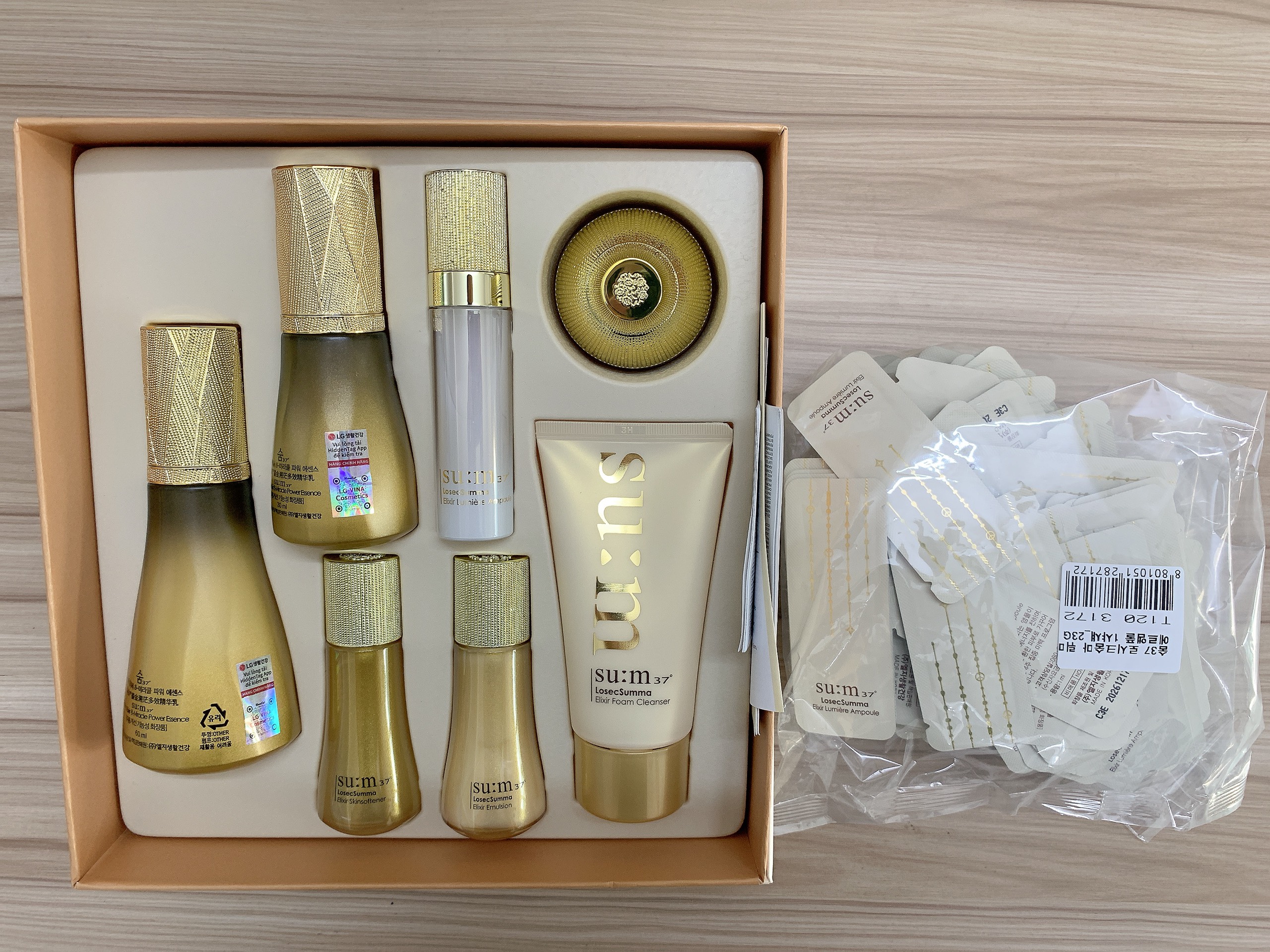 Bộ sản phẩm gồm: –Tinh chất chống lão hóa đa tác động cải thiện 8 vấn đề chuyên sâu Su:m37 Losec Summa Elixir Essence 60ml + 30ml – Nước cân bằng tái sinh da Sum37 Losec Summa Elixir Skin Softener 20ml – Sữa dưỡng cân bằng dầu và độ ẩm Su:m37 Losec Summa Elixir Emulsion 20ml – Kem dưỡng tái sinh da Su:m37 Losec Summa Elixir Cream 10ml – Sữa rửa mặt tái sinh da chiết xuất vàng Su:m37 Losec Summa Elixir Foam Cleanser 60ml – Tinh chất dưỡng trắng hồng Su:m37 LS Lumiere Ampoule 10ml Siêu tinh chất Losec Summa 8-Miracle Power Essence. là liệu pháp được mệnh danh như “thần dược chống lão hóa”. chứa đựng các thành phần cao cấp như Niacinamide, Peptide, Pro-retinol. kết hợp cùng với kỹ thuật lên men độc quyền giúp cải thiện rõ rệt. và đẩy lùi 8 dấu hiệu lão hóa tiêu biểu. mang lại sự trẻ hóa kỳ diệu cho làn da. Tinh chất mang lại hiệu quả cao nhưng đảm bảo an toàn. không gây kích ứng và phù hợp với mọi loại da.   Thành phần và công dụng: Nhờ sự kết hợp hoàn hảo giữa phương thức lên men truyền thống và các kỹ thuật tiên tiến. tạo nên công dụng dưỡng da và chống lão hóa hiệu quả vượt trội của sản phẩm. cho làn da cải thiện chỉ sau 01 tuần sử dụng