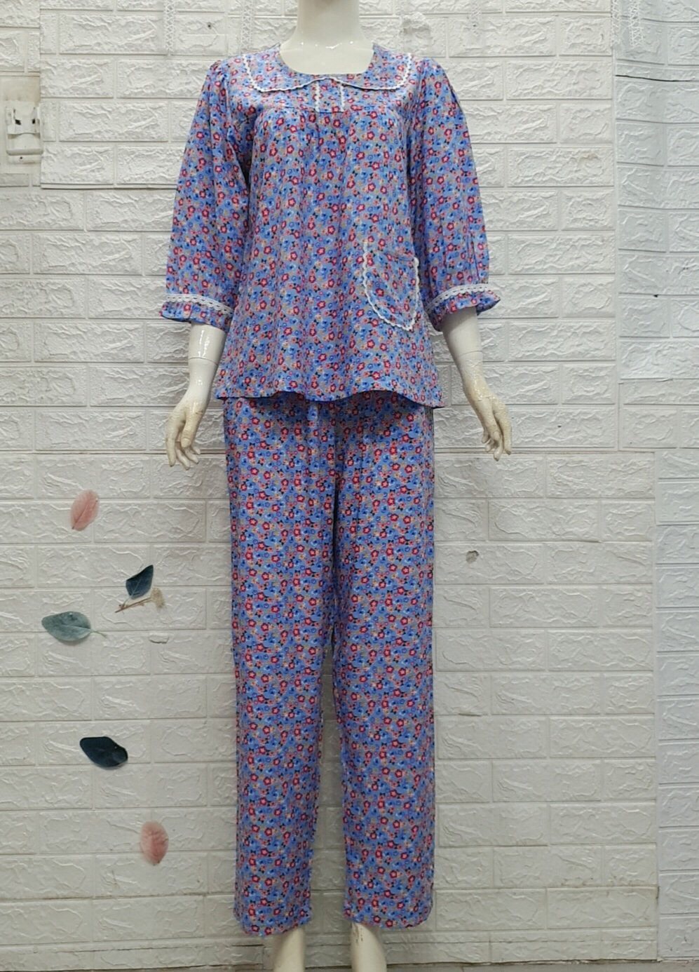 Đặc điểm nổi bật: - Cổ lá sen, tay lỡ - Kẹp ren trắng ở phần lá cổ, lai tay, lai quần - Chất liệu thun - Dáng bộ đồ dài - Thiết kế và