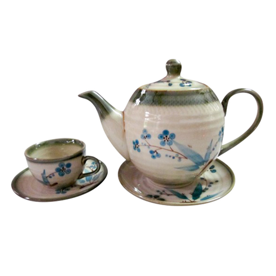 Ấm chén trà Bát Tràng - Bộ trà hoa nổi màu xanh coban
