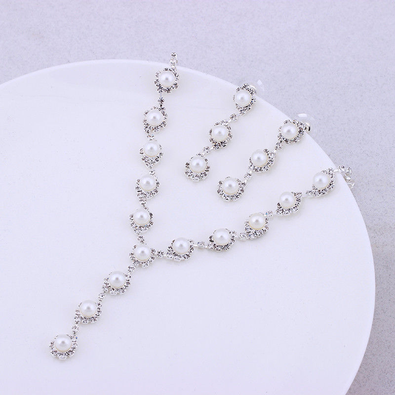Bộ trang sức 2 món vòng cổ và đôi bông tai chuỗi ngọc trai đơn giản tinh tế, nổi bật, lộng lẫy. Thích hợp trang điểm cô ngày cưới, chụp ảnh cưới, chụp ảnh dã