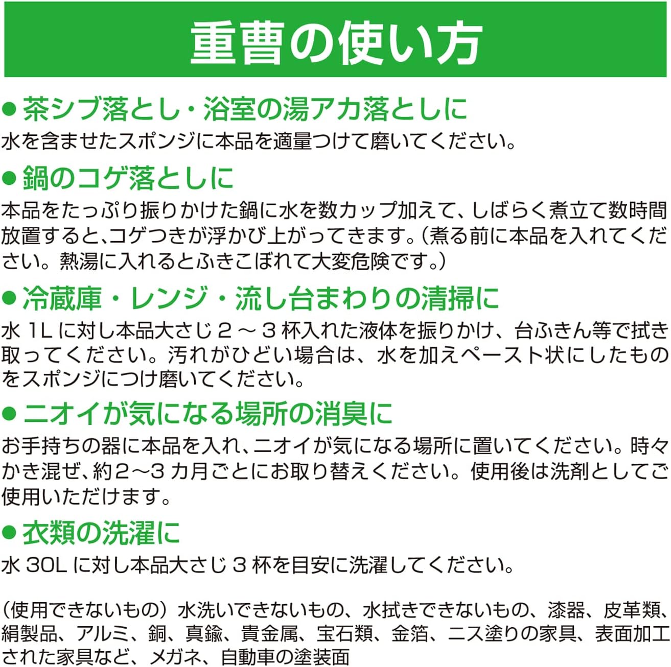 - Chất liệu:Natri hydro cacbonat (99% trở lên) là thành phần tự nhiên, an toàn cho sức khỏe người dùng ❉ Ưu điểm: ️ ○ Giúp ngâm rửa sạch nhựa trong rau, rửa các vết ố, bẩn của ấm trà, vết dầu mỡ, cháy xém trên vật dụng nhà bếp, tủ lạnh, khử mùi toilet, nhà tắm