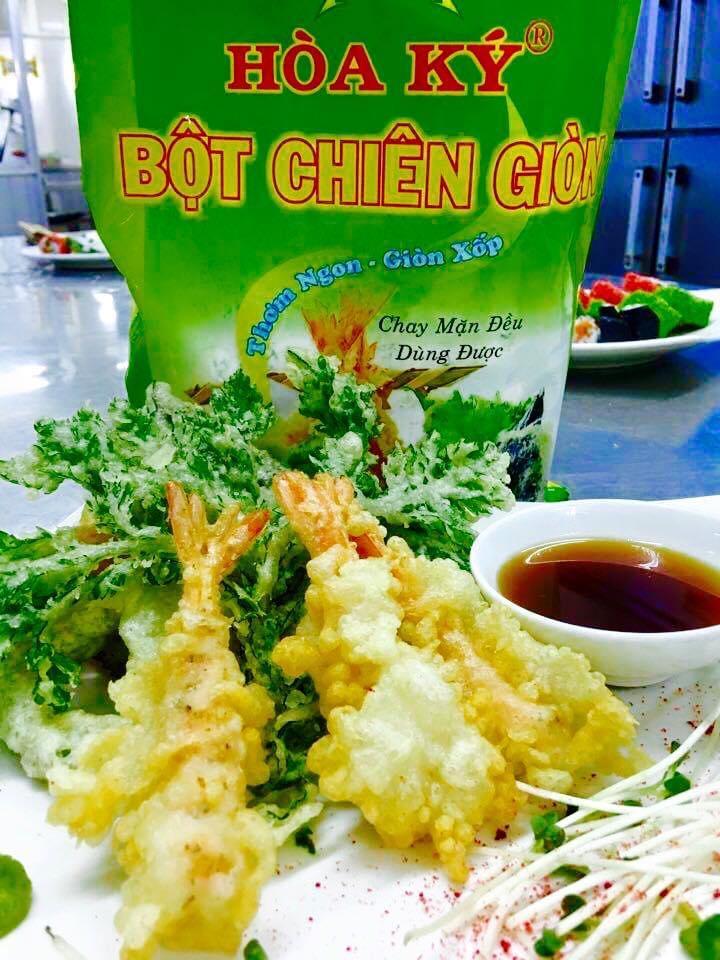Cho nước vào bột khuấy đều, đến khi bột mịn và sánh lại (đặc, lỏng tùy sở thích). Lần lượt nhúng các loại thực phẩm như tôm, cua, cá, mựác loại hoa quả , rau củ vào bột khô rồi nhúng vào bột đã khuấy. Chiên lửa vừa đủ để lớp bột phồng, xốp, giòn, vàng đều.Có thể thêm 1 muỗng canh dầu ăn và 1 muỗng cà phê nước chanh vào bột đã khuấy để cho bột giòn và xốp lâu hơn.