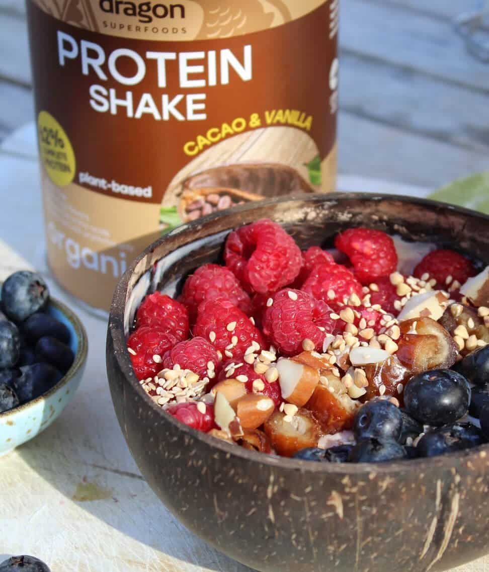 - Có thể thêm chuối, việt quất hoặc các loại trái cây yêu thích khác của bạn. Protein shake chuối và dừa của Dragon Superfoods ko có hương thơm và chất điều vị nhân tạo, ko chứa lactose và gluten. Thành phần: Protein hạnh nhân (30%), protein gạo (23%), protein đậu hà lan (22%), bột chuối (10%), đường ăn kiêng erythritol (8%). bột sữa dừa (7%).* từ nông nghiệp hữu cơ có chứng nhận. Cách sử dụng: 2 thìa bột protein shake (30g) với 250ml sữa thưc vật, sữa bò hoặc nước. Thêm chất tạo ngọt nếu muốn.