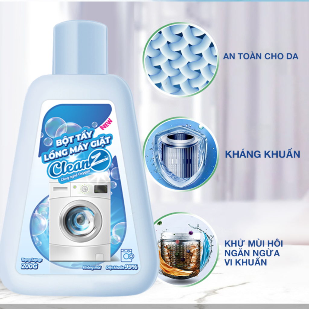 Kháng khuẩn: Bột tẩy lồng máy giặt CleanZ sử dụng chất oxy phân tử có hiệu quả diệt khuẩn khử mùi hôi, làm sạch cặn bẩn lâu ngày, giúp lồng giặt sạch sẽ. Nên vệ sinh lồng máy giặt 1-2 tháng một lần để bảo vệ sức khỏe, giữ quần áo sạch sáng.
