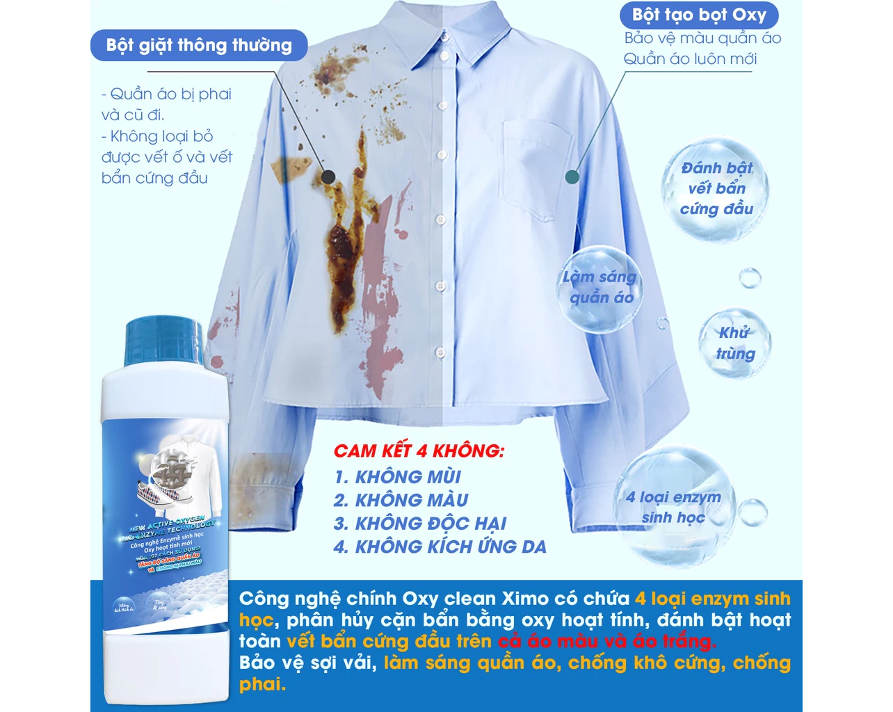 - Có quá nhiều vết bẩn khác nhau trong sinh hoạt hàng ngày đặc biệt quần áo và đồ dùng của bạn, sẽ rất tốn rất nhiều chi phí để xử lý cho từng loại vết bẩn nhưng không hiệu quả và gây mùi không tốt cho sức khỏe, nắm bắt được điều đó, Ximo Home ra mắt bột tẩy vết bẩn đa năng Oxi Clean đánh bay tất cả các loại vết bẩn cứng đầu
