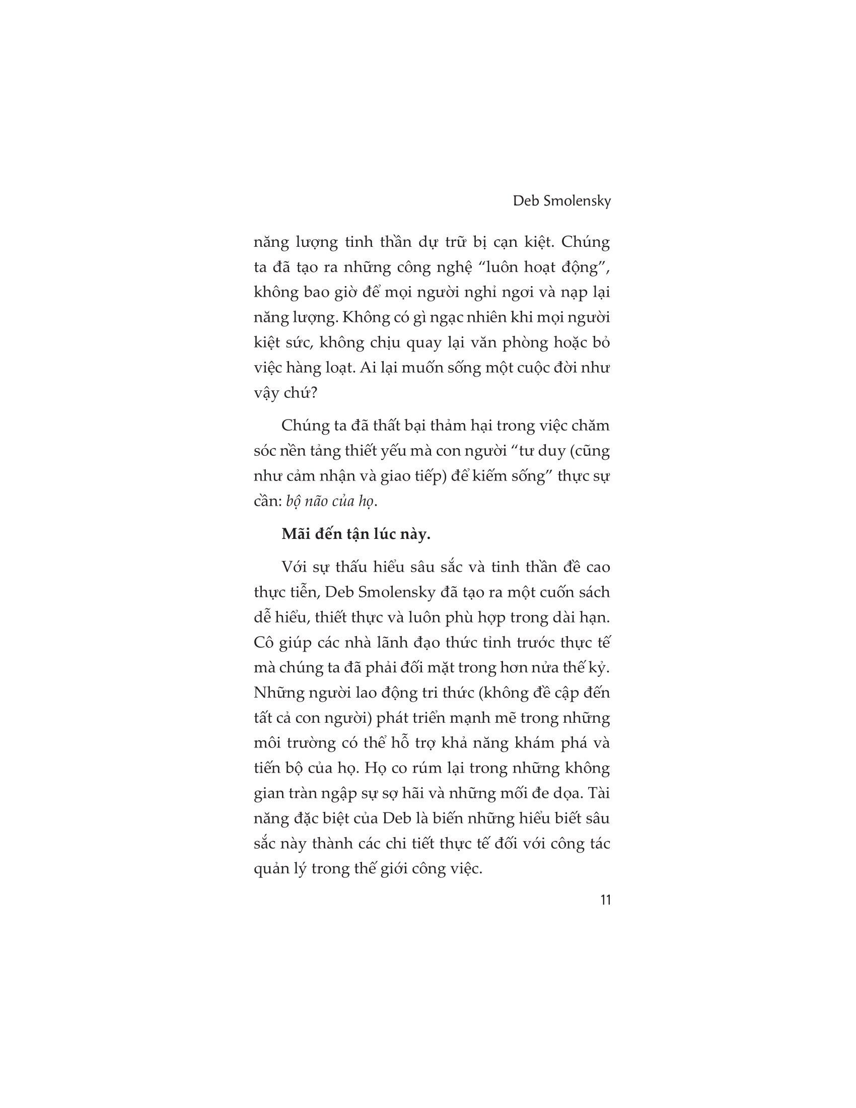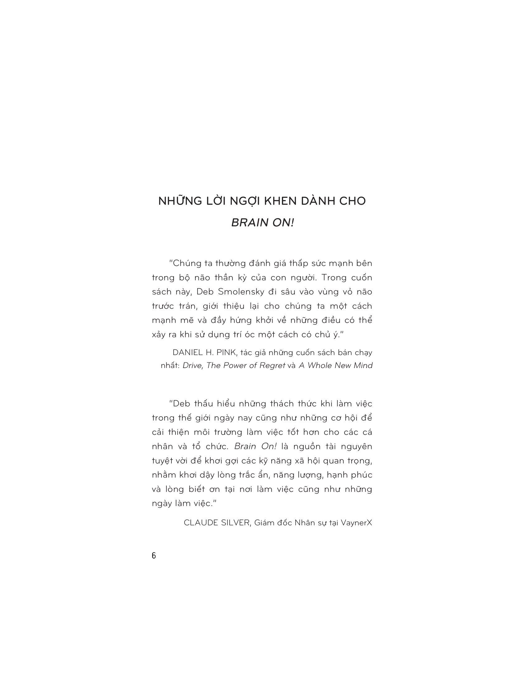 Trong Brain On!, tác giả Deb Smolensky giới thiệu các chiến lược rèn luyện tinh thần có tính thực tiễn cao để bạn sẵn sàng thể hiện bản thân trong môi trường làm việc nhiều áp lực và luôn thay đổi. Điều chúng ta hướng tới không chỉ là hoàn thành các mục tiêu công việc với hiệu suất tối ưu, mà còn là làm điều đó trong khi vẫn đảm bảo được sức khỏe tinh thần và thể chất, tràn đầy năng lượng cũng như tinh thần tích cực.