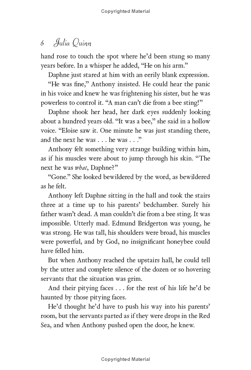 Contrary to popular belief, Kate is quite sure that reformed rakes do not make the best husbands—and Anthony Bridgerton is the most wicked rogue of them all. Kate’s determined to protect her sister—but she fears her own heart is vulnerable. And when Anthony’s lips touch hers, she’s suddenly afraid she might not be able to resist the reprehensible rake