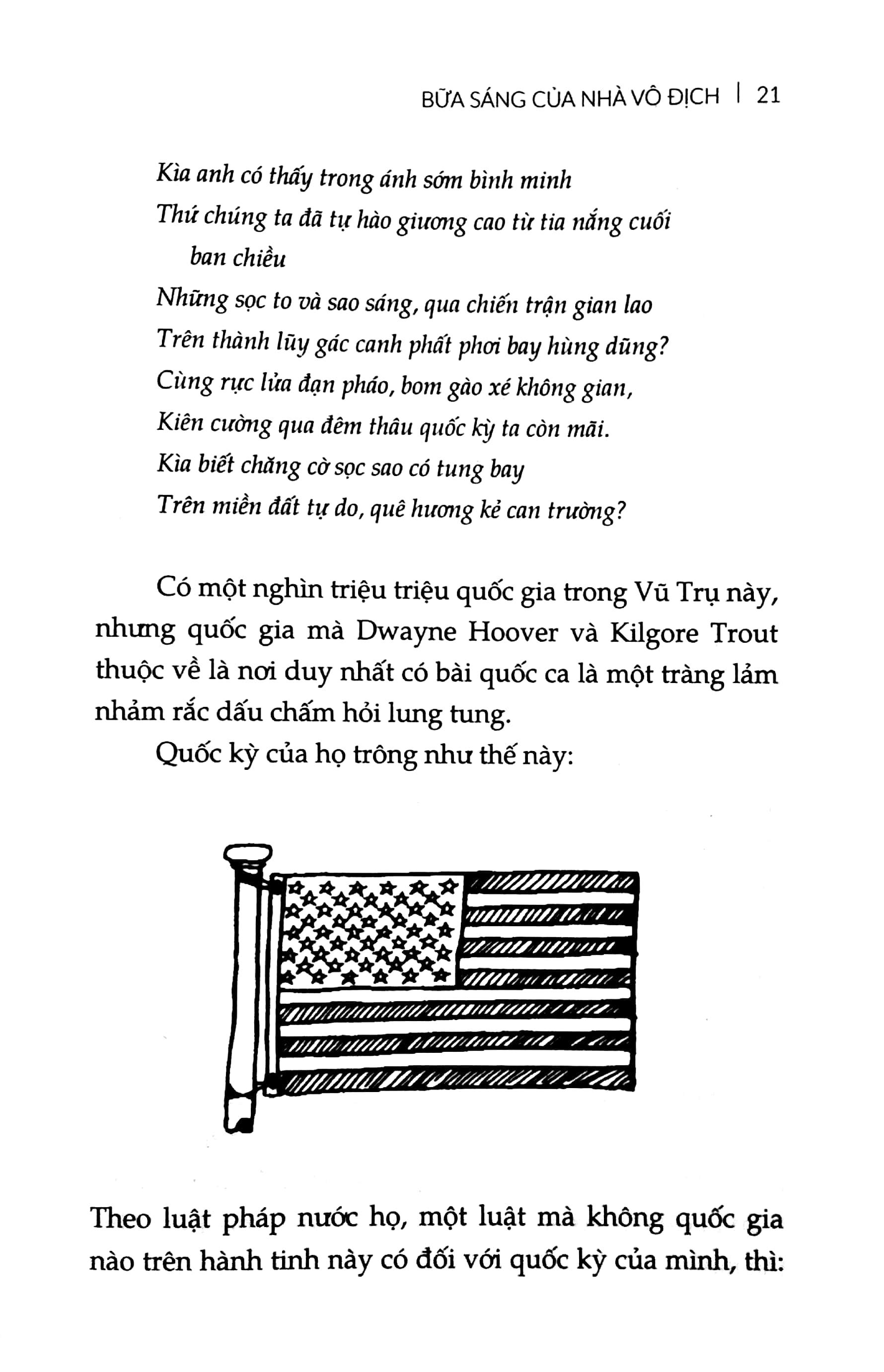 Sau Lò sát sinh số 5, ta lại được nếm thử thứ văn chương có một không hai của Kurt Vonnegut trong Bữa sáng của nhà vô địch: một trí tưởng tượng khó lường, một thứ hài hước đen vừa điên rồ, vừa nực cười, lại vừa buồn thảm. Cuốn sách là một cái nhìn thấu suốt vào tâm hồn nước Mỹ thập niên 70, ngạo nghễ trên đỉnh cao quyền lực, nhưng đồng thời cũng chênh vênh nơi rìa vực điên loạn.