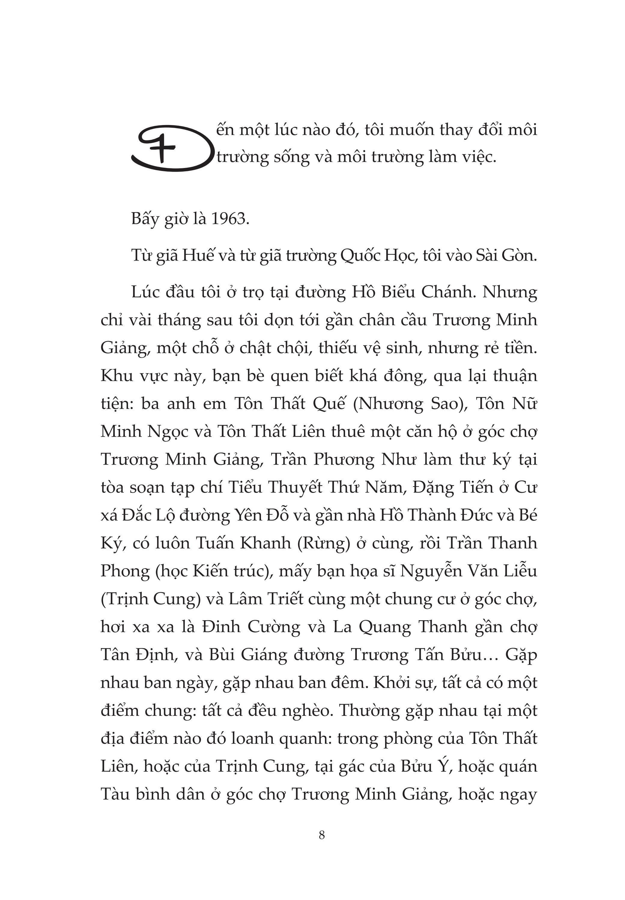 "Lạ vì trong ngày đó anh là người duy nhất mặc đồ trận của Quân lực Việt Nam Cọng Hoà với áo quần treillis và nón nhựa, tức lớp trong của nón trận. Anh nhởn nhơ trong nhung phục ấy với một bầy chó năm bảy con cột dính chùm quanh lưng, đi đâu kéo chúng ăng ẳng theo đó, thấy mà phát thương! Đồ trận và nón nhựa anh nhặt ngoài đường, bầy chó anh mua ngoài chợ Hàm Nghi. Trước ngày đổi đời anh nhận được một số tiền nhuận bút. Anh ra phố rủ trẻ đánh giày, đám trẻ cầu bơ cầu bất trôi sông lạc chợ cùng anh ăn nhậu, còn bao nhiêu anh mua chó để … phóng sanh!? Nhưng thay vì thả chúng tự do, anh lại cầm tù chúng theo cách của anh như thế. Mới đầu, bầy chó đông đến mấy chục con nhưng lúc tôi gặp anh trên đường Trương Minh Giảng xế Đại học Vạn Hạnh thì chỉ còn năm bảy con, có lẽ vì một số đã thoát khỏi xiềng xích, hoặc có người lén giải thoát …”