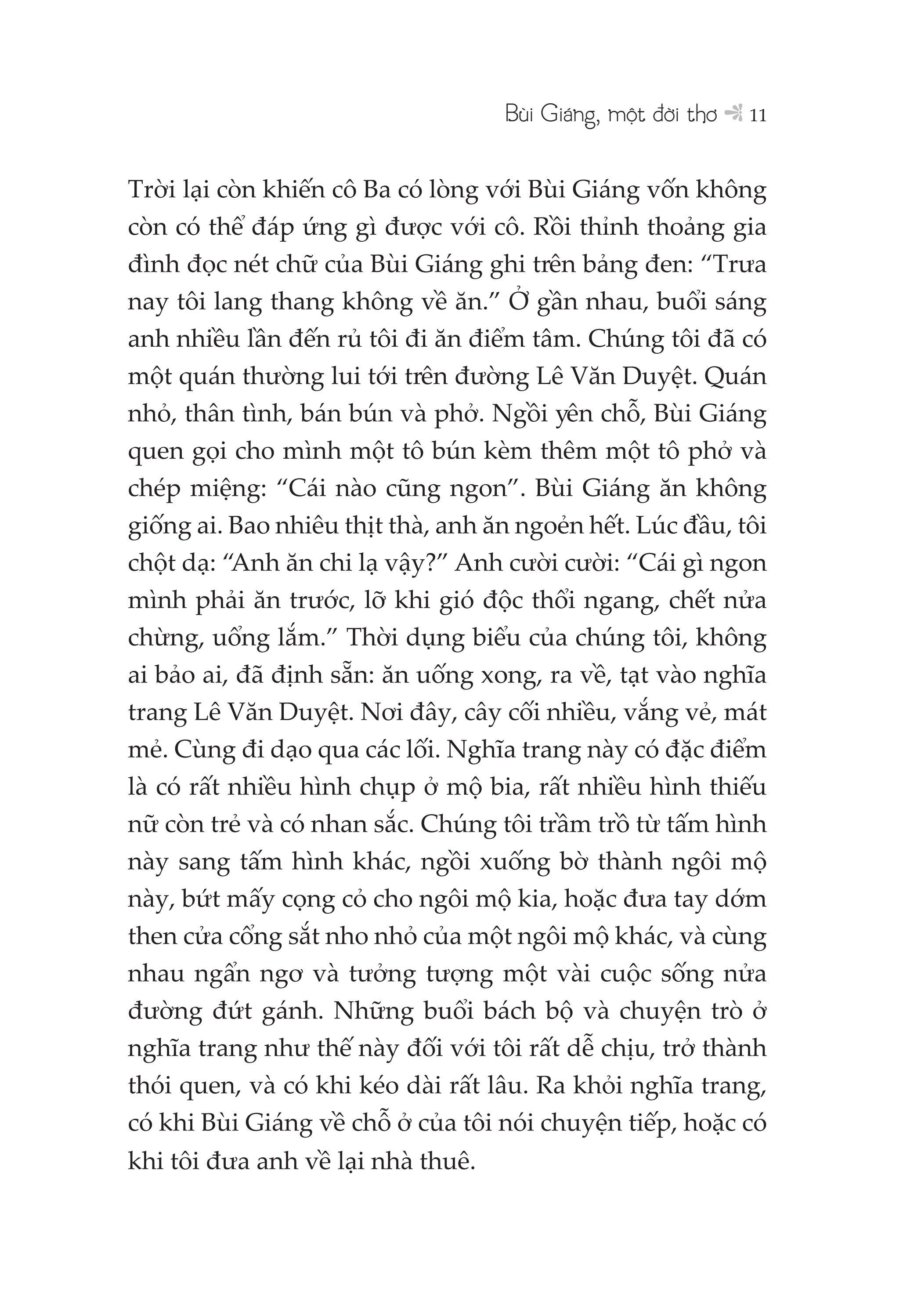 Đây là cuốn sách của nhà văn, dịch giả Bửu Ý, viết về Bùi Giáng, một giọng thơ vô tiền khoáng hậu của văn học Việt Nam thế kỷ XX. Dù viết bao nhiêu về Bùi Giáng, có lẽ cũng là không chính xác hoàn toàn vì ông đã trở thành một hiện tượng, một tượng đài ngôn ngữ, vậy mà qua ngòi bút của Bửu Ý, chúng ta không chỉ thấy Bùi Giáng mà còn thấy cả hơi thở, không khí thời đại mà hai người đã dự phần vào…