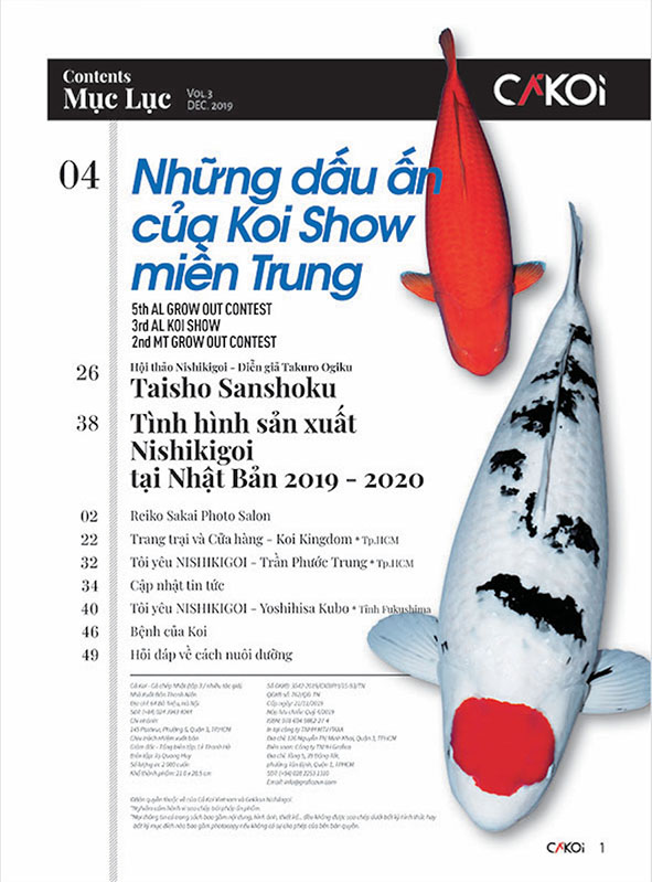 “CÁ KOI” là phiên bản tiếng Việt của Gekkan Nishikigoi (Koi Magazine do Shinkokai Nhật Bản phát hành), được phát hành định kỳ 3 tháng tại Việt Nam. Có trong tay quyển “CÁ KOI” nghĩa là có trong tay những thông tin mới, chuẩn xác và chính thống nhất về Koi nói chung, ngành Koi tại Nhật Bản và Việt Nam nói riêng.