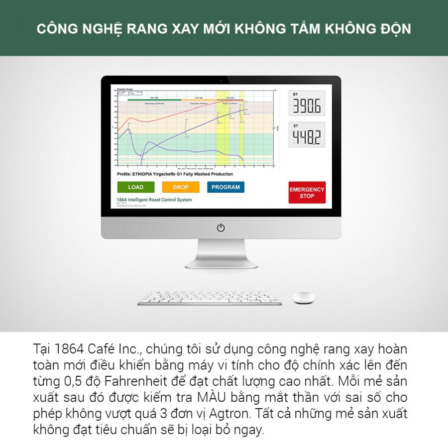 - Công nghệ rang xay mới từ 1864 Café Inc. Canada giữ nguyên hương thơm và vị ngon tuyệt vời của hạt cà phê, chính xác đến từng 0,5 độ Fahrenheit. Mỗi mẻ sản xuất sau đó được kiểm tra MÀU bằng mắt thần.