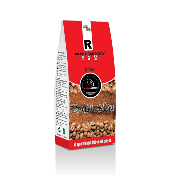 Thông Tin Sản Phẩm: Thương Hiệu: ROVINA Xuất Xứ: Việt Nam Đơn vị tính: Gói Trọng lượng tịnh: 250gr Hạn sử dụng:1 năm Độ ẩm: ≤ 5 % Hàm lượng caffein:>1,5% MÔ TẢ SẢN PHẨM ROBUSTA hay Cà phê vối chứa hàm lượng caffein cao hơn và có hương vị không tinh khiết bằng cà phê chè, do vậy mà được đánh giá thấp hơn. Giá một bao cà phê vối thường chỉ bằng một nửa so với cà phê chè. Hiện nay gần 90% diện tích cà phê ở Việt Nam được trồng cà phê vối, 10% trồng cà phê chè, khoảng 1% còn lại được trồng cà phê mít (Coffea excelsa). Cà phê Robusta Cây cà phê vối có dạng cây gỗ hoặc cây bụi, chiều cao của cây trưởng thành có thể lên tới 10m. Quả cà phê có hình tròn, hạt nhỏ hơn hạt cà phê chè (tức cà phê arabica). Hàm lượng caffein trong hạt cà phê vối khoảng 2-4%, trong khi ở cà phê chè chỉ khoảng 1-2%. Giống như cà phê chè, cây cà phê vối 3-4 tuổi có thể bắt đầu thu hoạch. Cây cho hạt trong khoảng từ 20 đến 30 năm. Cà phê vối ưa sống ở vùng nhiệt đới, độ cao thích hợp để trồng cây là dưới 1000 m. Nhiệt độ ưa thích của cây khoảng 24-29°C, lượng mưa khoảng trên 1.000 mm. Cây cà phê vối cần nhiều ánh sáng mặt trời hơn so với cây cà phê chè Đặc tính: + Thể chất mạnh + Vị cân bằng – Hướng dẫn sử dụng: Xay cà phê trước khi pha chế, sản phẩm phù hợp tất cả các kiểu pha, Cà phê hạt xay Robusta khi pha có màu đen nhạt, Mùi thơm nhẹ, vị êm và hơi đắng
