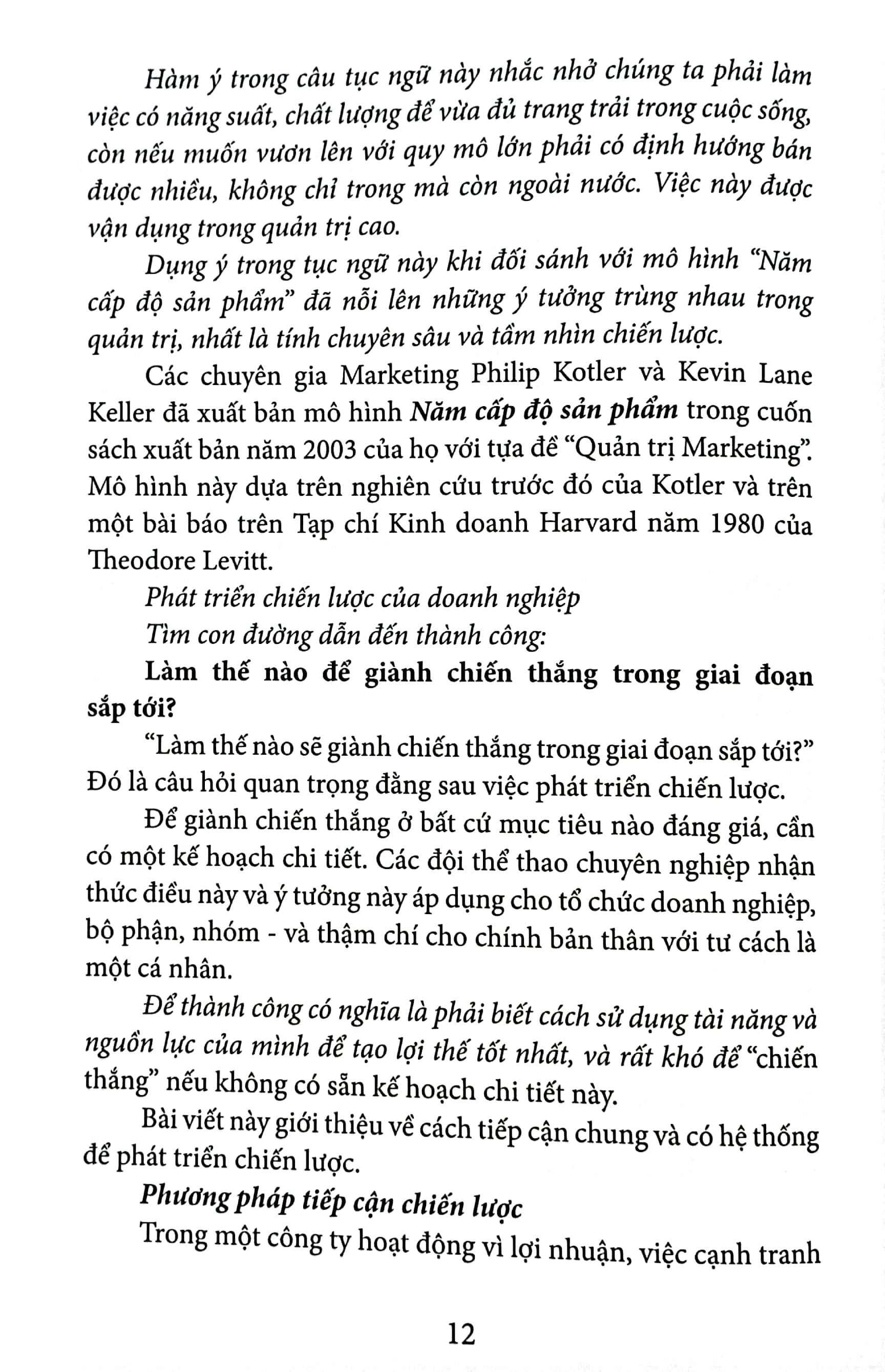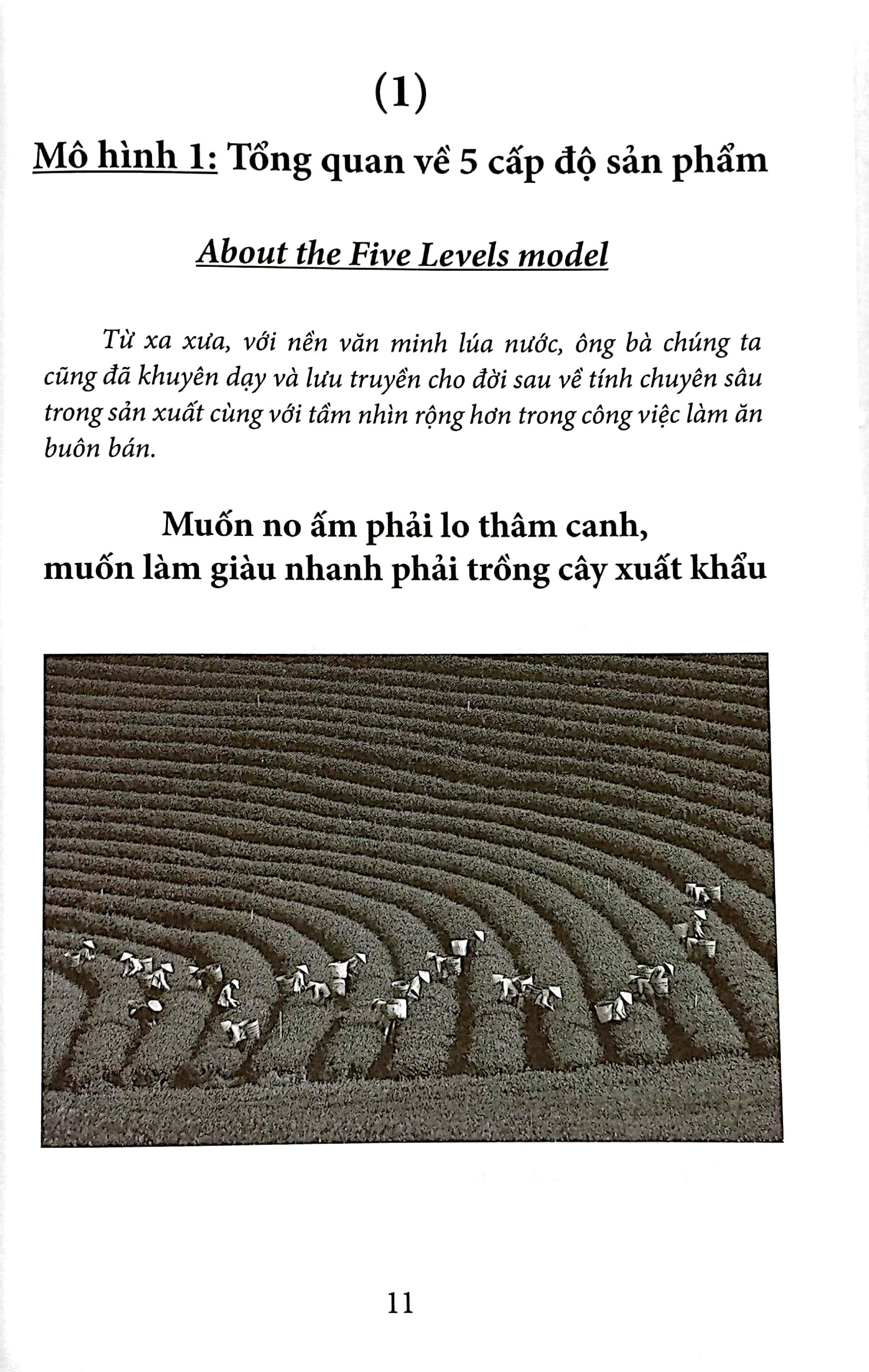 Mô hình đầu tiên được giới thiệu là Tổng quan về 5 cấp độ sản phẩm – “About the Five Levels Model” của chuyên gia Marketing Philip Kotler và Kevin Lane Keller. Mô hình này được các tác giả cuốn sách đối sánh với câu tục ngữ “Muốn no ấm phải lo thâm canh, muốn làm giàu nhanh phải trồng cây xuất khẩu” thông qua sự trùng hợp trong quản trị kinh doanh về tính chuyên sâu và tầm nhìn chiến lược. Qua đó, các tác giả tiến hành phân tích sâu hơn về phương pháp tiếp cận chiến lược, phân tích môi trường bên trong, bên ngoài; Phân tích đối thủ cạnh tranh; Phân tích khách hàng và các bên liên quan qua các giai đoạn.
