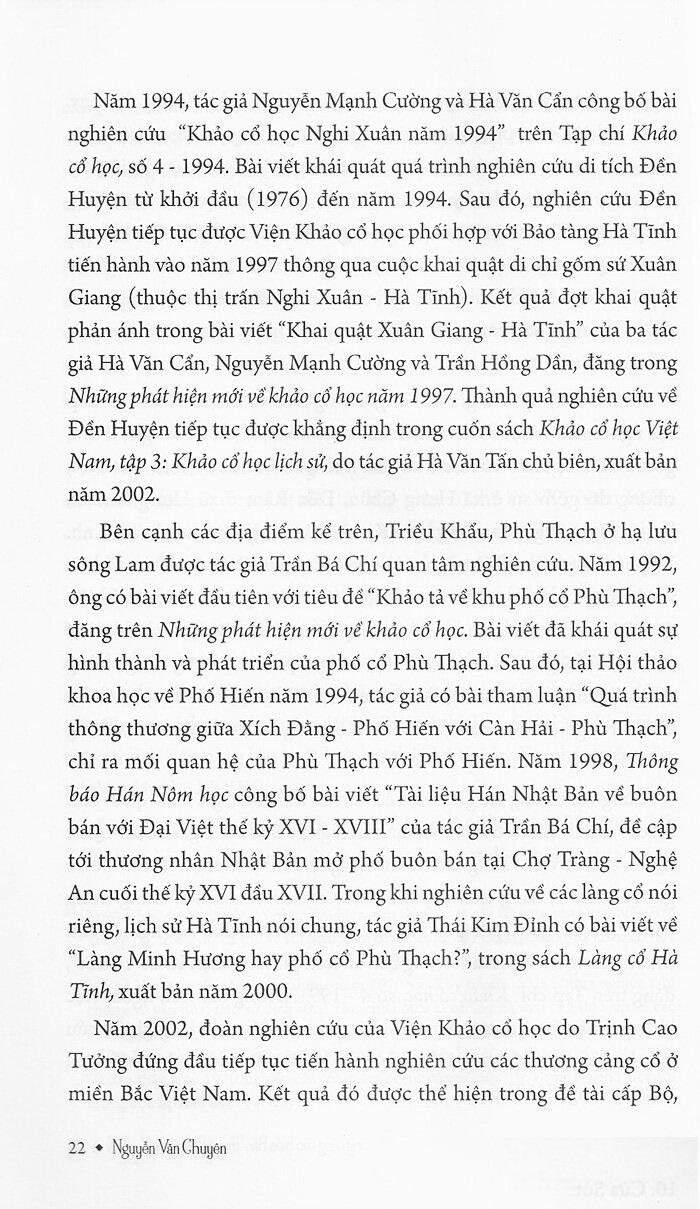 Cuốn sách “Các thương cảng ven biển Bắc Trung Bộ thế kỷ X - XIX” của tác giả Nguyễn Văn Chuyên được phát triển từ luận án Tiến sĩ Sử học của chính tác giả, bảo vệ tại Trường Đại học Khoa học Xã hội và Nhân văn, Đại học Quốc gia Hà Nội vào năm 2018. Luận án có tầm cỡ một công trình nghiên cứu chuyên sâu không chỉ có ý nghĩa khoa học mà còn thiết thực đóng góp vào công cuộc nghiên cứu phục vụ sự nghiệp phát triển kinh tế - xã hội và an ninh vùng Bắc Trung Bộ của Tổ quốc.