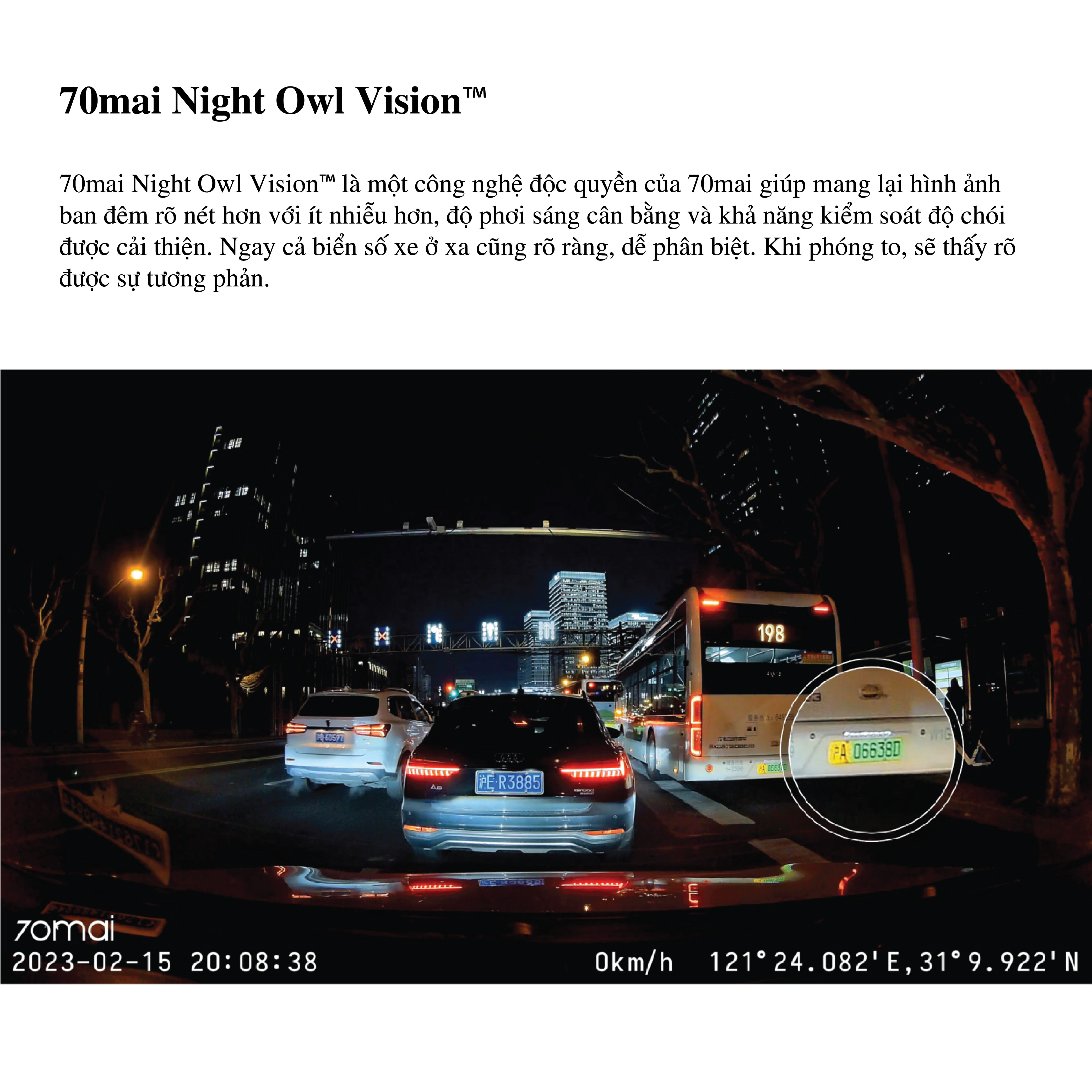 70mai Night Owl Vision là một công nghệ độc quyền của 70mai giúp mang lại hình ảnh ban đêm rõ nét hơn với ít nhiễu hơn, độ phơi sáng cân bằng và khả năng kiểm soát độ chói được cải thiện. Ngay cả biển số xe ở xa cũng rõ ràng, dễ phân biệt. Khi phóng to, sẽ thấy rõ được sự tương phản