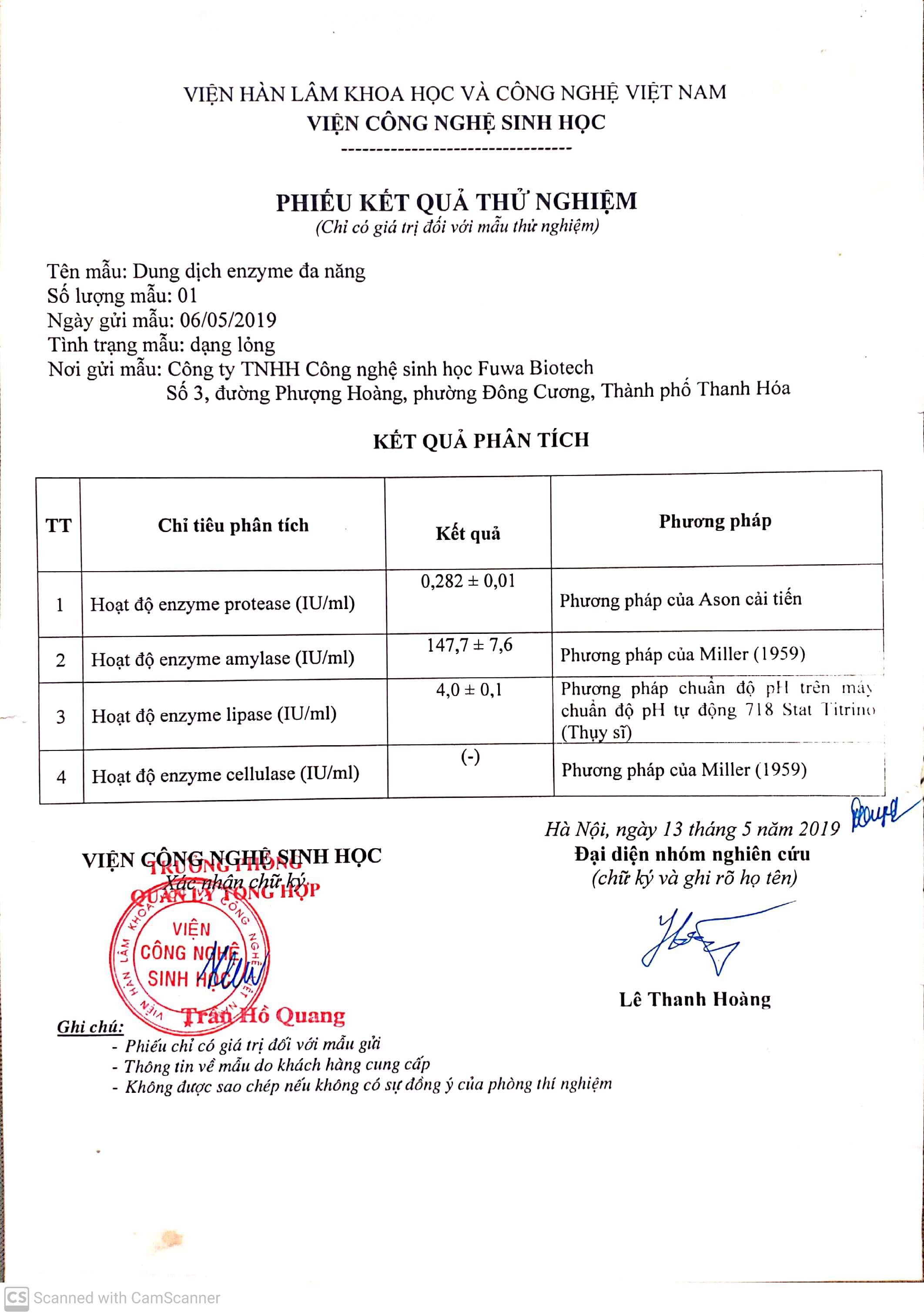 Nước ngâm rửa thực phẩm Fuwa3e ứng dụng công nghệ Eco enzyme, kết hợp với những nguyên liệu 100% tự nhiên từ địa phương: dứa Bỉm Sơn và đường Lam Sơn. Nước ngâm rửa thực phẩm có thể loại bỏ tốt hàm lượng chất hóa học trong thực phẩm hàng ngày. Có thể nói đây là một giải pháp thay thế hoàn hảo cho phương pháp ngâm muối thông thường đã được Viện hóa học công nghiệp Việt Nam chứng nhận về mức độ hiệu quả.