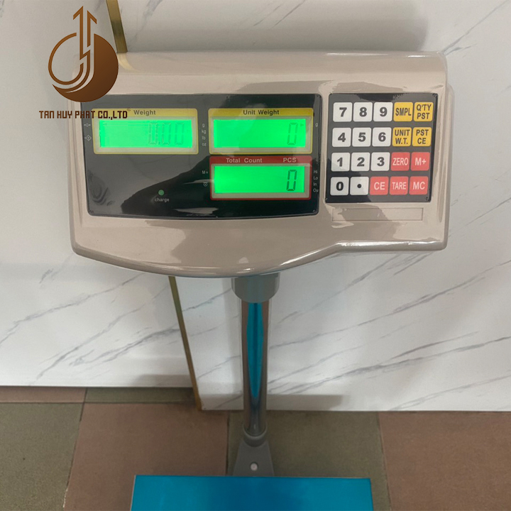 Hiển thị: Màn hình LCD 6 số đen, nền xanh. Hiển thị: Khối lượng, Khối lượng 1 đơn vị mẫu, Số lượng.