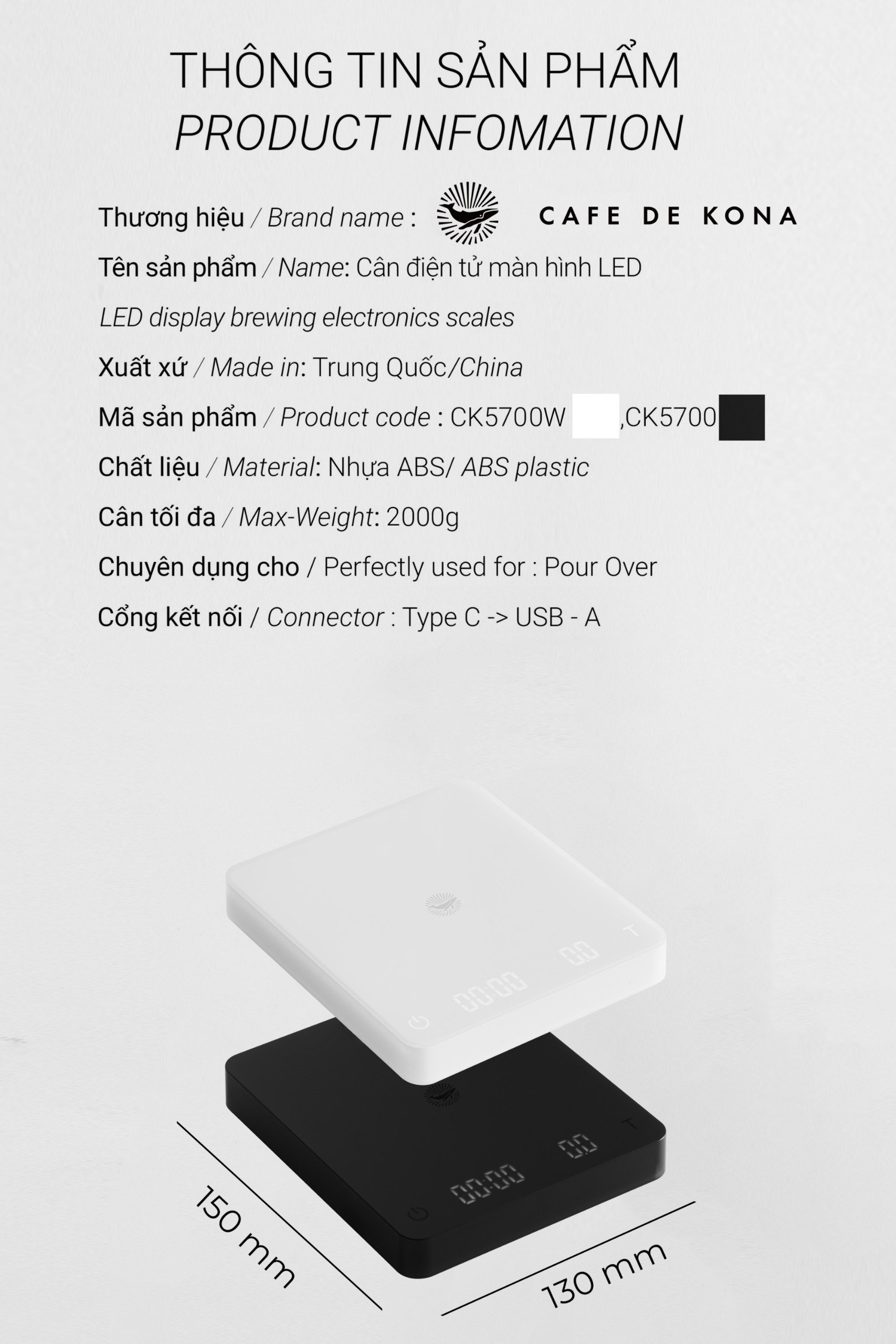 *Cân mới không có miếng lót nhựa. CÂN ĐIỆN TỬ PHA CHẾ CHẾ CÓ ĐẾM GIỜ Với ngôn ngữ thiết kế vuông bo tròn ở cạnh giản đơn, hiện đại và nhỏ gọn. Nhưng được trang bị những tính năng chuẩn nhất. Một sản phẩm công nghệ phục vụ cho dân barista chuyên nghiệp. Cân với bề mặt kính sang trọng, cao cấp và rất dễ lau sạch.  CHỨC NĂNG NỔI BẬT Tính năng độc đáo DUAL SCREEN với  màn hình hiển thị trạng thái giúp barista có thể quan sát được thông tin hiển thị của quá trình pha . Sử dụng pin Lithium sạc lại qua cổng USB type C . Thời gian phản hồi cực nhanh – 50ms kể từ khi có thay đổi về khối lượng trên cân. Tự động tắt khi không sử dụng Màn hình LED siêu sáng: Sử dụng trong mọi điều kiện ánh sáng kể cả tắt đèn thường chỉ xuất hiện trên những dòng cân cao cấp hơn như Acaia hoặc Brewista. Tự động tắt đèn sau 15s. Phím bấm cảm ứng: Quá nhẹ nhàng khi sử dụng. Bề mặt cân rộng rãi: Để cả 1 bình pha Chemex 6 cup lên mà vẫn thoải mái. Tích hợp bộ đếm thời gian: Dành cho những ai sử dụng cân pha Pour over THÔNG TIN SẢN PHẨM  Thương hiệu: CAFE DE KONA Xuất xứ: Trung Quốc Đơn vị cân: g Khối lượng cân tối đa: 2000gram Nguồn: Pin Li-Thium 3.7V/1600mAh