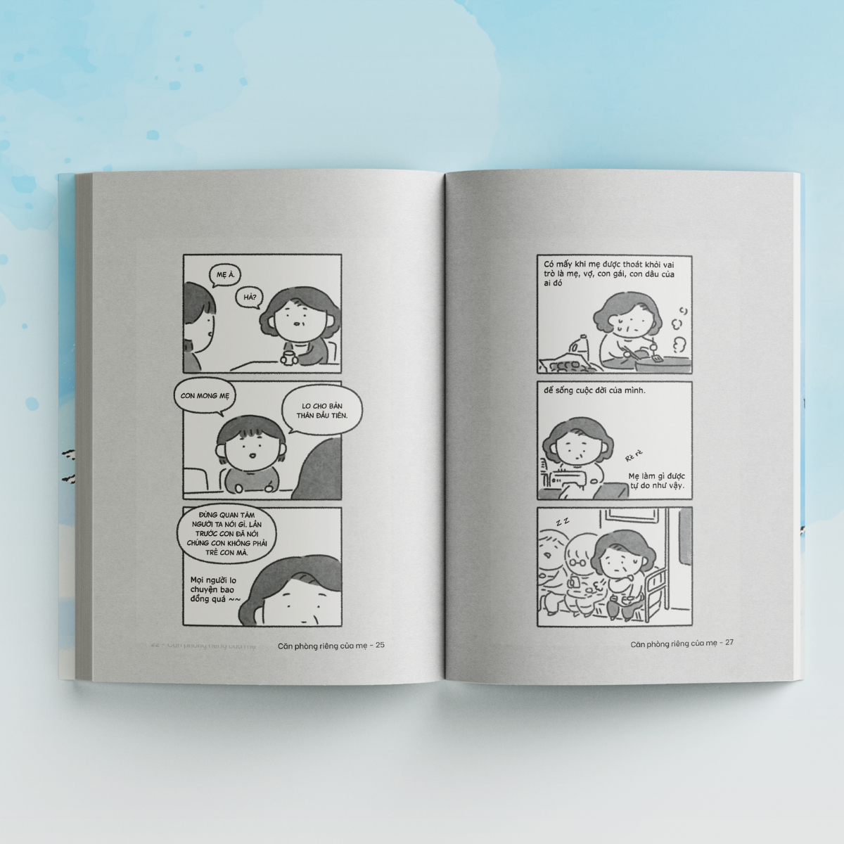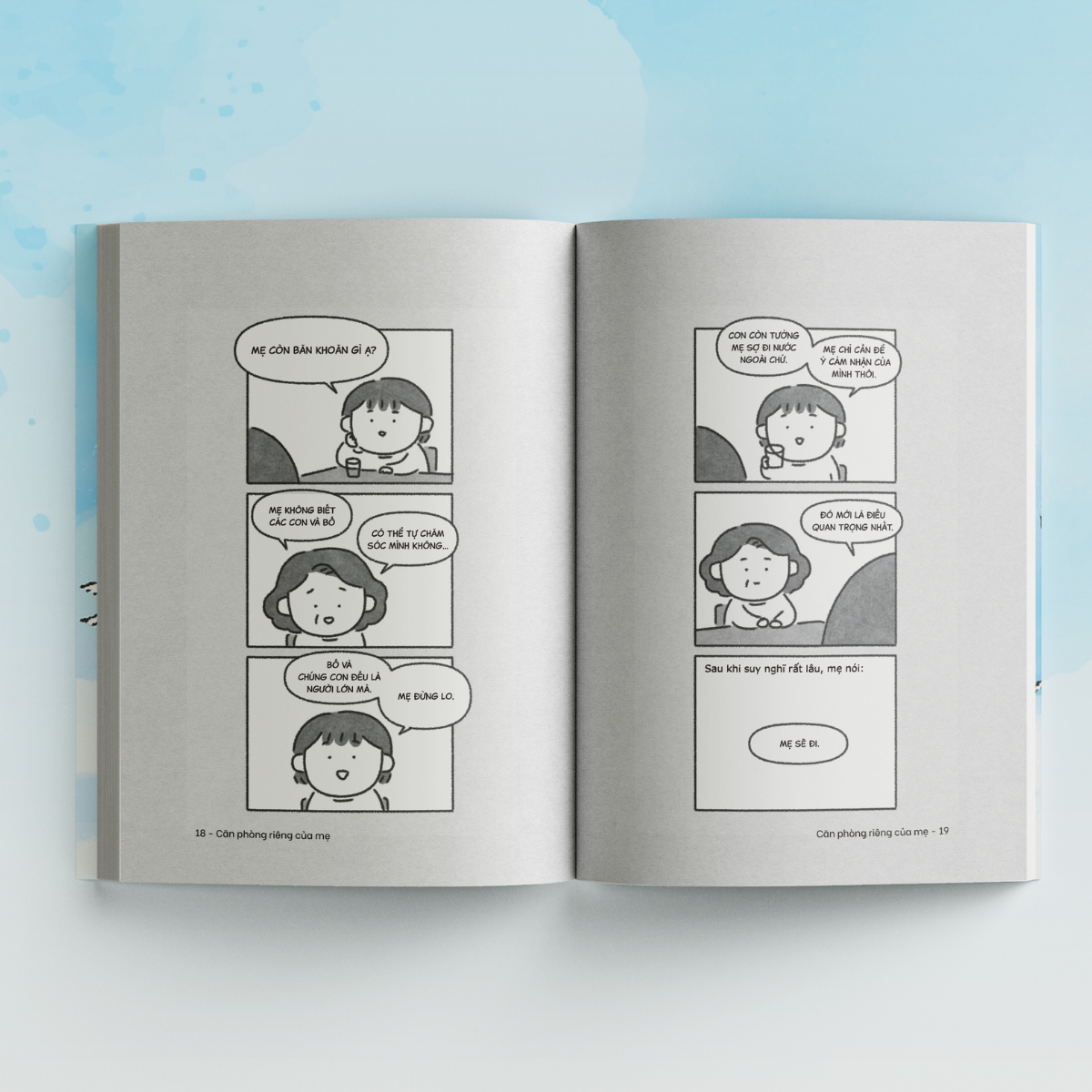 “Căn phòng riêng của mẹ” là cuốn sách tranh kể về một hành trình đầy cảm xúc của người mẹ tuổi 50 đã dám bước ra khỏi vùng an toàn, để bay từ Hàn Quốc đến Việt Nam làm việc. Dù phải rời xa gia đình và cuộc sống thân quen, trải qua nhiều băn khoăn lo lắng, nhưng chính sự thay đổi ấy đã mang đến cho mẹ một căn phòng riêng, một thế giới mới, nơi mẹ có thể theo đuổi cuộc sống mình mong ước.