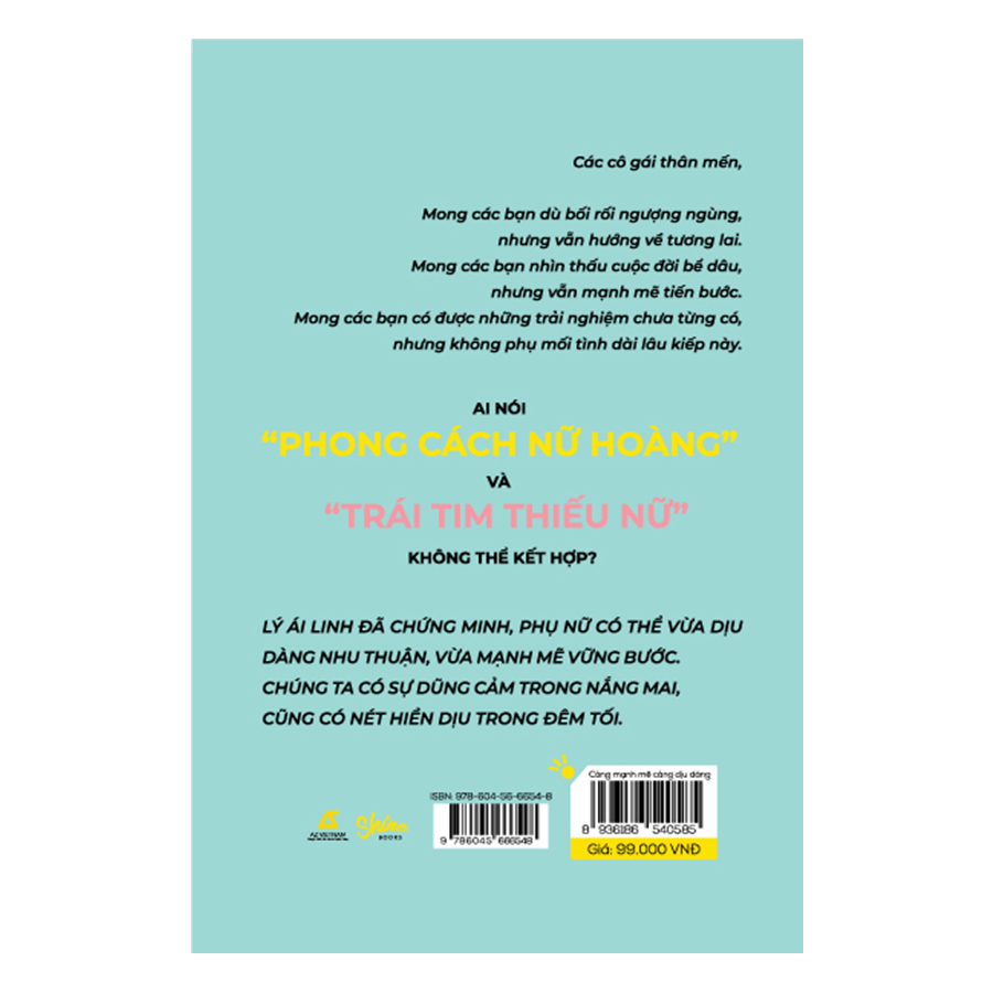 Càng Mạnh Mẽ, Càng Dịu Dàng “Trong công việc phụ nữ cũng phải cố gắng và dốc sức dốc lòng như đàn ông, nhưng tận sâu trong nội tâm, phụ nữ vẫn là phụ nữ. Không cần thiết phải xù lông, quyết không cúi đầu, sự mạnh mẽ thật sự của người phụ nữ chính là tính đàn hồi, là độ dẻo dai, là sau khi em xông pha dạn dĩ bên ngoài rồi vẫn có thể là phụ nữ.” Đó là thứ thiên tính mà sự trưởng thành không thể nào giết chết được: Ấm áp, dịu dàng, ngây thơ, chân thành. Chúng khiến chúng ta quay trở lại bản thân ở trạng thái nguyên thủy nhất, đánh thức trái tim thiếu nữ đáng giá nhất: Một chiếc váy ngủ thêu tay, mặt dây chuyền hình trái tim, đôi cúc bọc nhung, đủ để khiến sắt đá cũng phải tan chảy, nâng đỡ tâm hồn mong manh trải qua sự lạnh lẽo của nhân tình thế thái, sự chán ngán của cuộc sống phù phiếm. Là nữ vương nhưng cũng vẫn mang trong mình trái tim của một thiếu nữ. Trái tim thiếu nữ, không phải vô tri một cách ngốc nghếch, cũng không mềm yếu kiểu đáng thương, càng không phải kiểu ngóng trông bạch mã hoàng tử tới. Đó là những ý nguyện ban đầu của chúng ta, là sự dịu dàng và lương thiện dành cho thế giới này, là sự chân thành và tình yêu nồng nhiệt với cuộc sống. “Càng mạnh mẽ, càng dịu dàng” là giáo án tiếp theo, cũng là giáo án tuyệt vời nhất mà tác giả Lý Ái Linh muốn dành cho những người phụ nữ mang trong mình sự dũng cảm trong nắng mai và cả nét hiền dịu trong đêm tối để sống giữa trường học cuộc đời này thật tự do, đầy yêu thương. Các cô gái thân mến, Mong bạn dẫu lạc lối trên đường đời nhưng vẫn tìm thấy hy vọng ở tương lai. Mong bạn nhìn thấu tang thương nhưng vẫn cứng cỏi kiên cường. Mong bạn hoàn thành giấc mơ nhưng đừng phụ tình yêu cách trở. Càng mạnh mẽ lại càng dịu dàng…