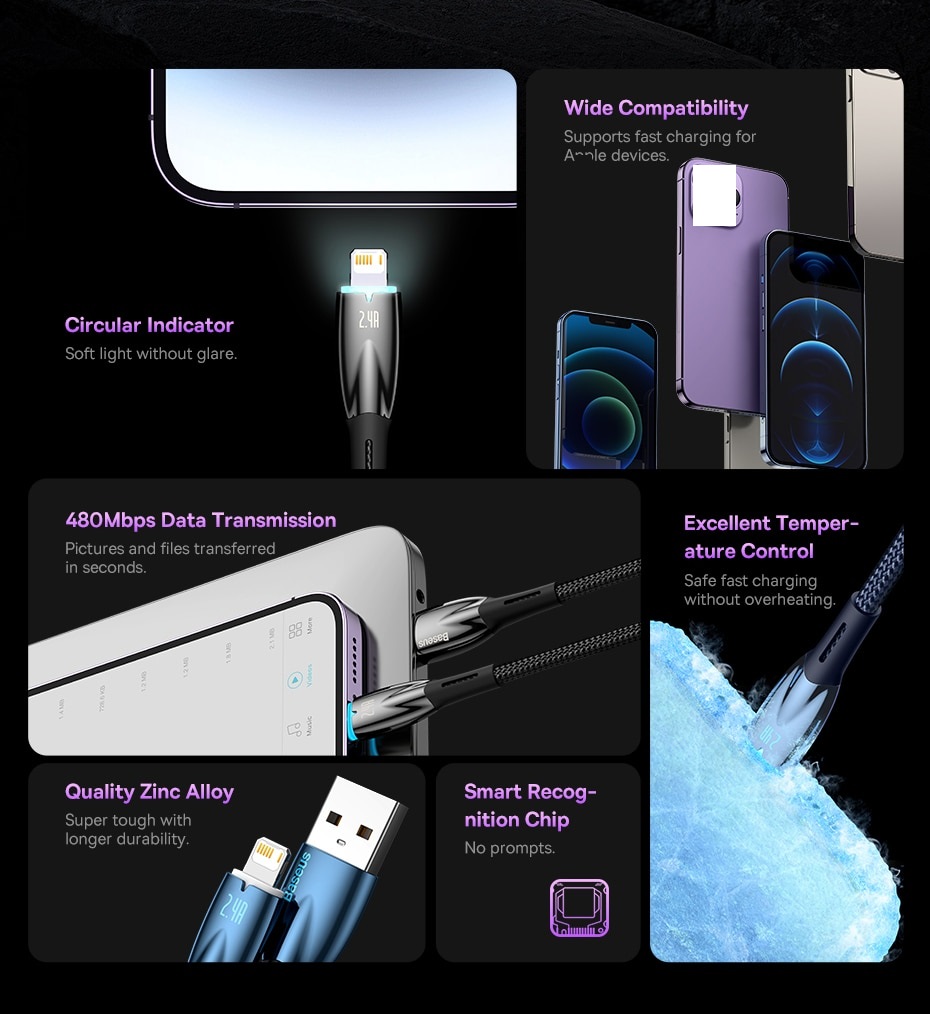 Cáp sạc Baseus Baseus X- shaped Light chân Lighting và Type C (Sạc nhanh, Sợi Carbon Siêu Bền, Led đổi màu khi sạc đầy) Tính năng cơ bản Cáp Baseus X- shaped Light chân Lighting