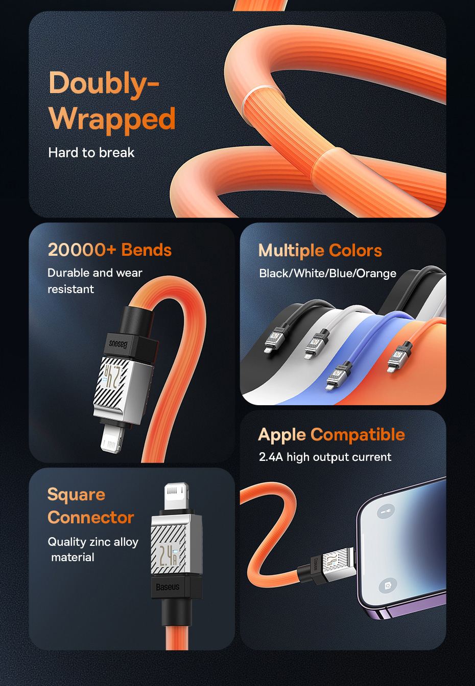 Cáp sạc Baseus CoolPlay Series Fast Charging Cable USB to Lai-nin 2.4A được làm bằng chất liệu cao cấp, bao gồm đồng nguyên chất và vỏ bọc bằng nhựa TPE không độc hại. Vỏ bọc nhựa TPE có đặc tính đàn hồi và chống bám bụi, giúp cáp sạc dễ dàng sử dụng và bảo vệ dây cáp khỏi độ bện và rối. Bên cạnh đó, các đầu kết nối Lai-nin của cáp sạc được làm bằng kim loại chất lượng cao, giúp tăng độ bền và tuổi thọ của sản phẩm.