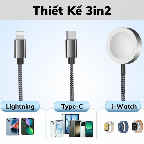 THÔNG TIN CƠ BẢN - Thương hiệu: WiWU - Model: Wi-C060 - Loại cáp: Type-C to Type-C + 'Lightning' + Type-C - Chiều dài cáp: 120cm - Chất liệu: Dây bện dù siêu bền, đầu cáp