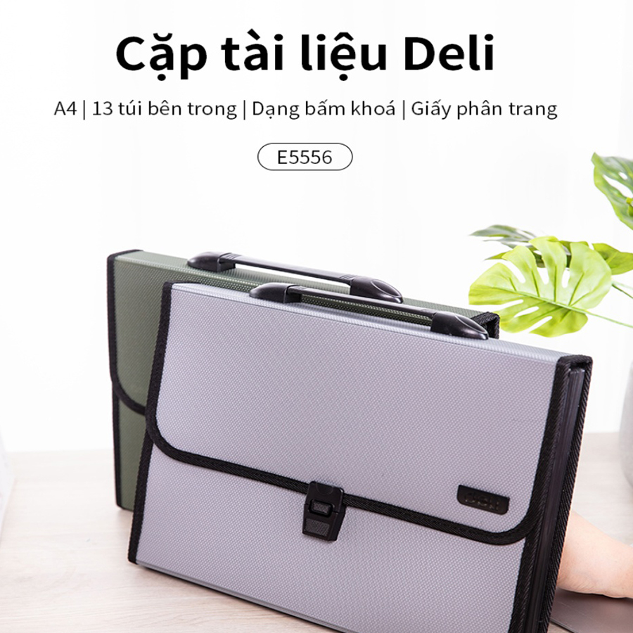 Cặp Tài Liệu 5557 Deli Cặp Tài Liệu 5557 Deli được làm từ chất liệu nhựa cứng cáp, bền đẹp. Cặp có thiết kế 12 ngăn kèm quai xách tiện lợi, thích hợp để bạn
