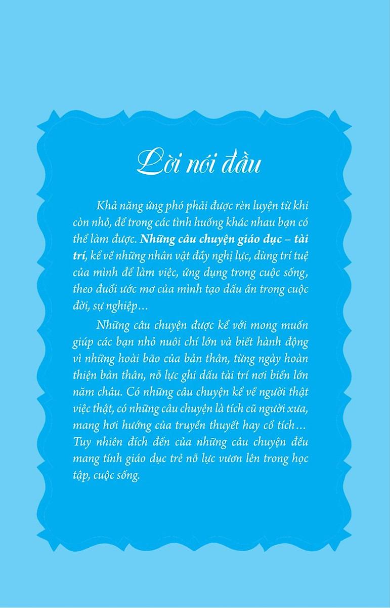 Câu chuyện giáo dục gồm 5 cuốn chủ đề về Tài trí, Kiên trì, Đạo đức, Dũng cảm, Nhân hậ được biên soạn gồm các truyện thuộc mọi thời đại, mọi xã hội trong và ngoài nước. Nội dung các câu chuyện thể hiện tấm lòng đạo đức, đức hiếu sinh, đạo đức buông xả, sự tài trí; lòng nhân hậu, sự kiên trì, dũng cả Giúp trẻ có những tấm gương sáng để học tập, rút được các kinh nghiệm ứng xử thật thông minh, hữu ích cho việc đối nhân xử thế.