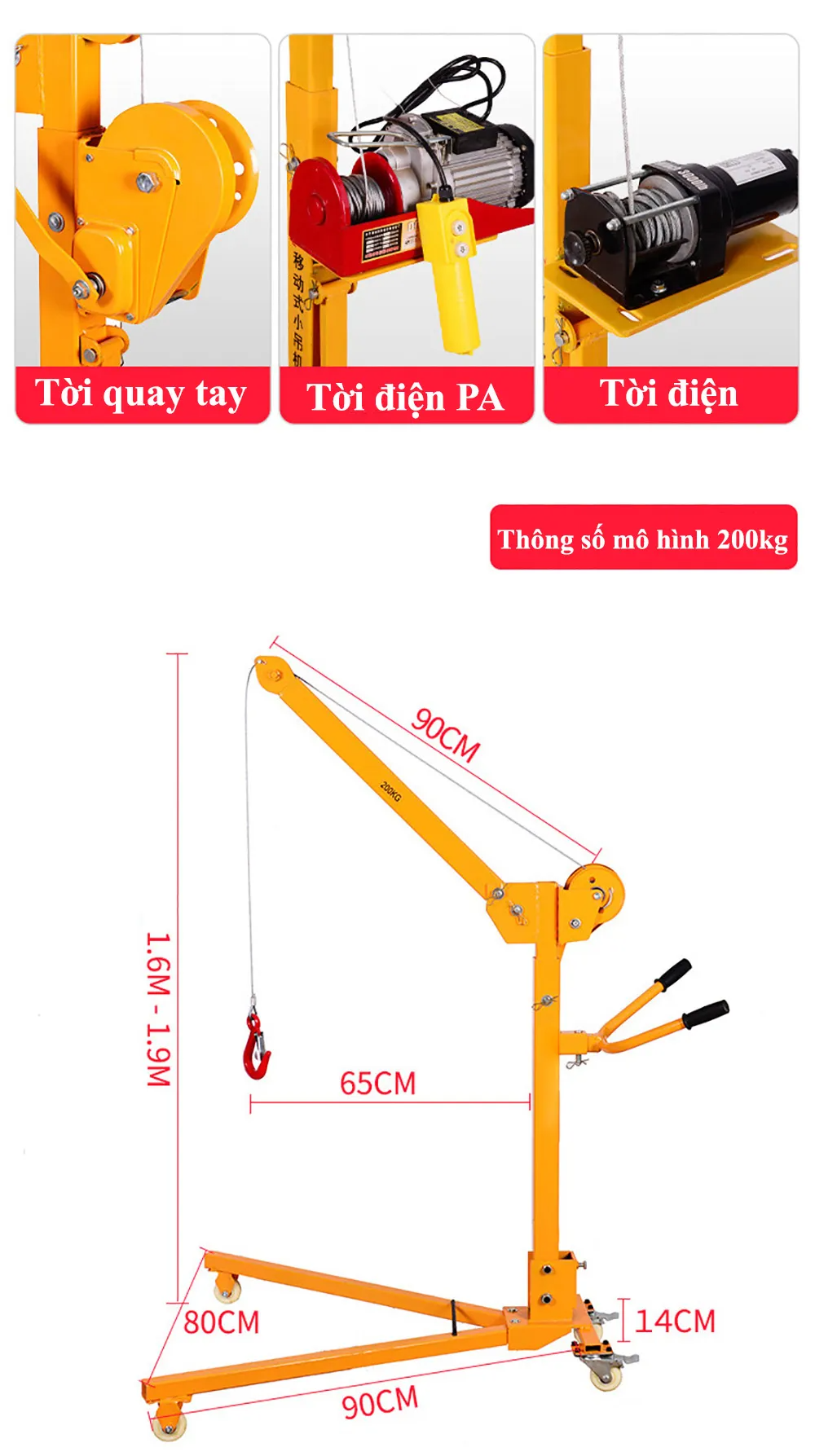 Thông số kĩ thuật: Trọng lượng: 38 kg Trọng Tải: 200 kg Cao: 185 cm Càng vươn: 108 cm Chiều dài cần: 105 cm Khe mở càng: 82cm Độ dài cáp: 3.5m Kích cỡ cáp: