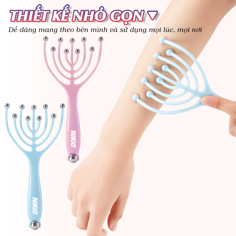 Thiết kế nhỏ gọn thích hợp sử dụng mọi lúc Ưu điểm của cây massage đầu bạch tuộc cao cấp Nikio NK-01C: 10 quả bóng massage xoay 360 độ Nikio NK-01C được thiết kế với 10 quả bóng massage có khả năng xoay linh hoạt 360 độ. Các bóng massage tác động đa điểm vào các huyệt đạo vùng đầu giúp kích thích tuần hoàn máu và cải thiện cảm giác căng thẳng nhanh chóng. Các quả bóng xoay đều, mang lại cảm giác thư giãn tối đa cho người dùng. Bóng lăn mượt, hạn chế kẹt tóc Với thiết kế bóng lăn mượt mà, sử dụng cây massage đầu Nikio NK-01C sẽ tránh được tình trạng kẹt tóc, mang lại sự thoải mái và an toàn khi sử dụng. Bạn có thể yên tâm sử dụng sản phẩm mà không lo bị đau hay rối tóc. Thiết kế giống bàn tay người Cây massage đầu Nikio NK-01C có thiết kế giống bàn tay người, giúp mang lại trải nghiệm massage chân thật và dễ chịu. Thiết kế này không chỉ tạo cảm giác thoải mái mà còn giúp massage đều khắp vùng da đầu. Tay cầm lõm, cầm nắm thoải mái Tay cầm của cây matxa đầu Nikio NK-01C được thiết kế lõm, giúp cầm nắm thoải mái và chắc chắn. Bạn có thể dễ dàng điều chỉnh lực massage theo ý muốn mà không bị trơn trượt hay mỏi tay. Chất liệu tốt, đồ đàn hồi cao Sản phẩm được làm từ chất liệu nhựa cao cấp, có độ đàn hồi cao, đảm bảo độ bền và an toàn cho người sử dụng. Chất liệu này cũng giúp sản phẩm nhẹ nhàng và dễ dàng vệ sinh sau khi sử dụng. Kiểu dáng đẹp, màu sắc đa dạng Cây mát xa đầu Nikio NK-01C có kiểu dáng đẹp và hiện đại, với nhiều màu sắc để lựa chọn như xanh, hồng, phù hợp với sở thích cá nhân và tạo điểm nhấn thẩm mỹ cho sản phẩm. Thiết kế nhỏ gọn, tiện dụng Với thiết kế nhỏ gọn, người dùng có thể dễ dàng mang cây massage đầu Nikio NK-01C theo bên mình và sử dụng mọi lúc, mọi nơi. Dù là ở nhà, văn phòng hay khi đi du lịch, bạn đều có thể tận hưởng những phút giây thư giãn với cây massage đầu cao cấp này. Lợi ích khi sử dụng: