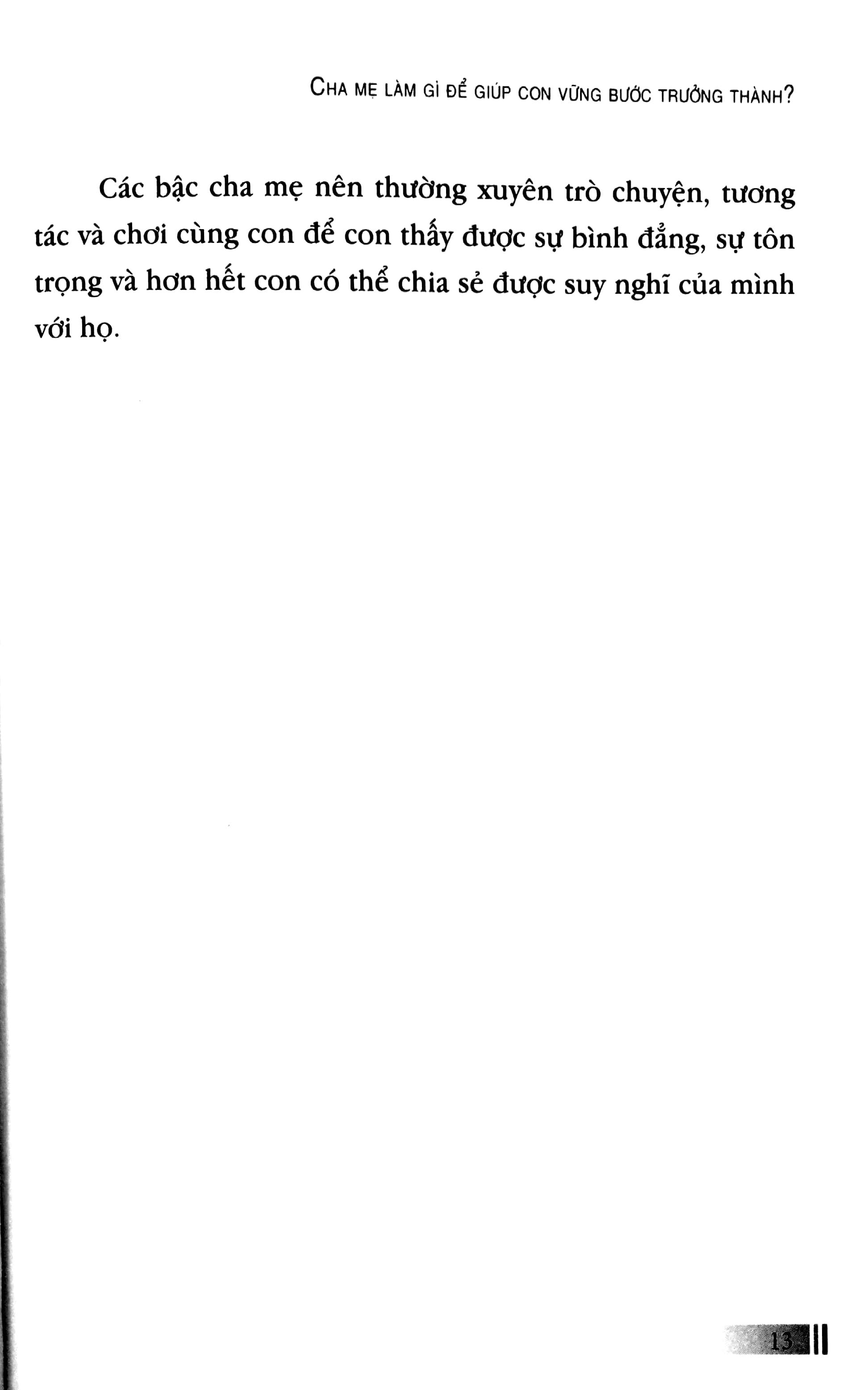 Đã có nhiều cuốn sách nói về bí quyết nuôi dạy con, chia sẻ những quan điểm trong việc nuôi dạy con cái. Tuy không có một phương pháp nào là chuẩn mực đối với mọi đứa trẻ, và cuốn sách Cha mẹ làm gì để con vững bước trưởng thành? là chia sẻ của những bậc cha mẹ về việc giáo dục, phát triển cho con cả về thể chất, trí tuệ lẫn tâm hồn. Với những gợi ý đơn giản, những bí quyết thiết thực và hữu ích, đây không chỉ là một cuốn sách hay mà còn là một món quà ý nghĩa, một người bạn hỗ trợ đắc lực dành cho những bậc cha mẹ mong muốn tâm hồn trẻ thơ của con phát triển toàn diện trong tương lai.