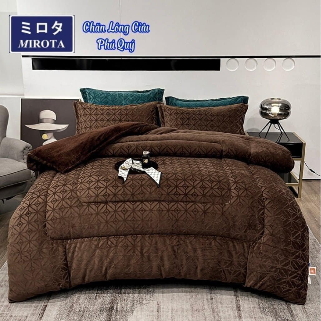 - Màu sắc :6 màu : Đỏ lưu ly ,Tím lavender ,Nâu chocolate ,Xanh rêu đá ,Xám thạch anh, Xanh lục bảo. Cấu tạo 3 lớp: Mặt trên là lớp nhung dạng sóng mướt mịn sang trọng , ở giữa là lớp bông tơ tằm dẻo mềm giúp giữ nhiệt tốt hơn, và mặt dưới là Lớp lông cừu tăm nhỏ mịn có khả năng tạo hơi ấm ngay lập tức & giữ nhiệt cực tốt. Không rụng lông ko dính bết . An toàn với mọi làn da Không bị dồn hay vón cục khi sử dụng cũng như làm vệ sinh giặt giũ. Có túi xách lịch sự mang đi biếu tặng